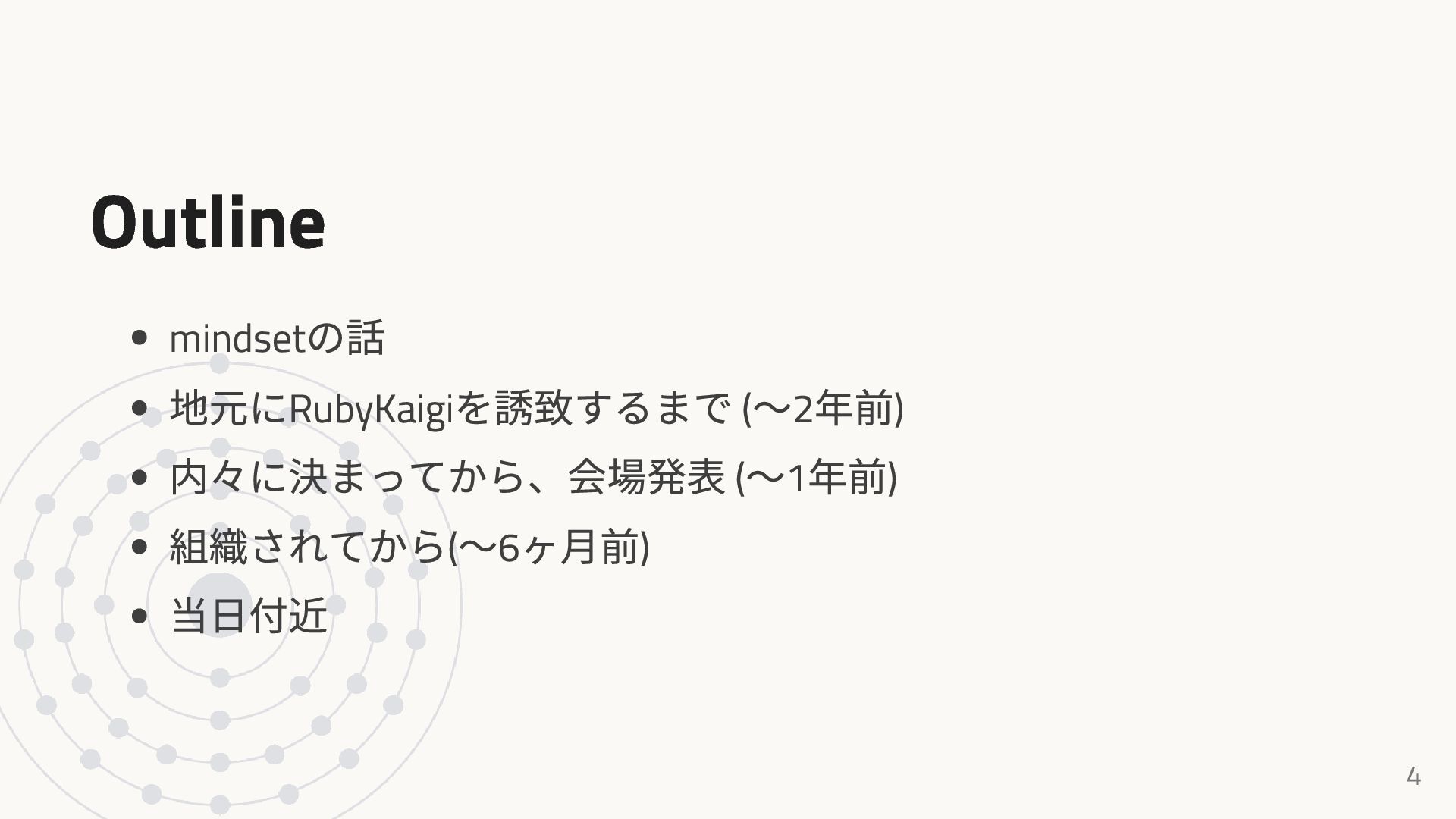 Outline mindsetの話 地元にRubyKaigiを誘致するまで (〜2年前) 内々に決まってから、会場発表 (〜1年前) 組織されてから(〜6ヶ月前) 当日付近 4