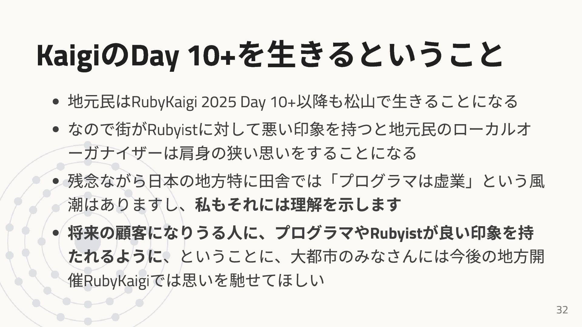 KaigiのDay 10+を生きるということ 地元民はRubyKaigi 2025 Day 10+以降も松山で生きることになる なので街がRubyistに対して悪い印象を持つと地元民のローカルオ ーガナイザーは肩身の狭い思いをすることになる 残念ながら日本の地方特に田舎では「プログラマは虚業」という風 潮はありますし、私もそれには理解を示します