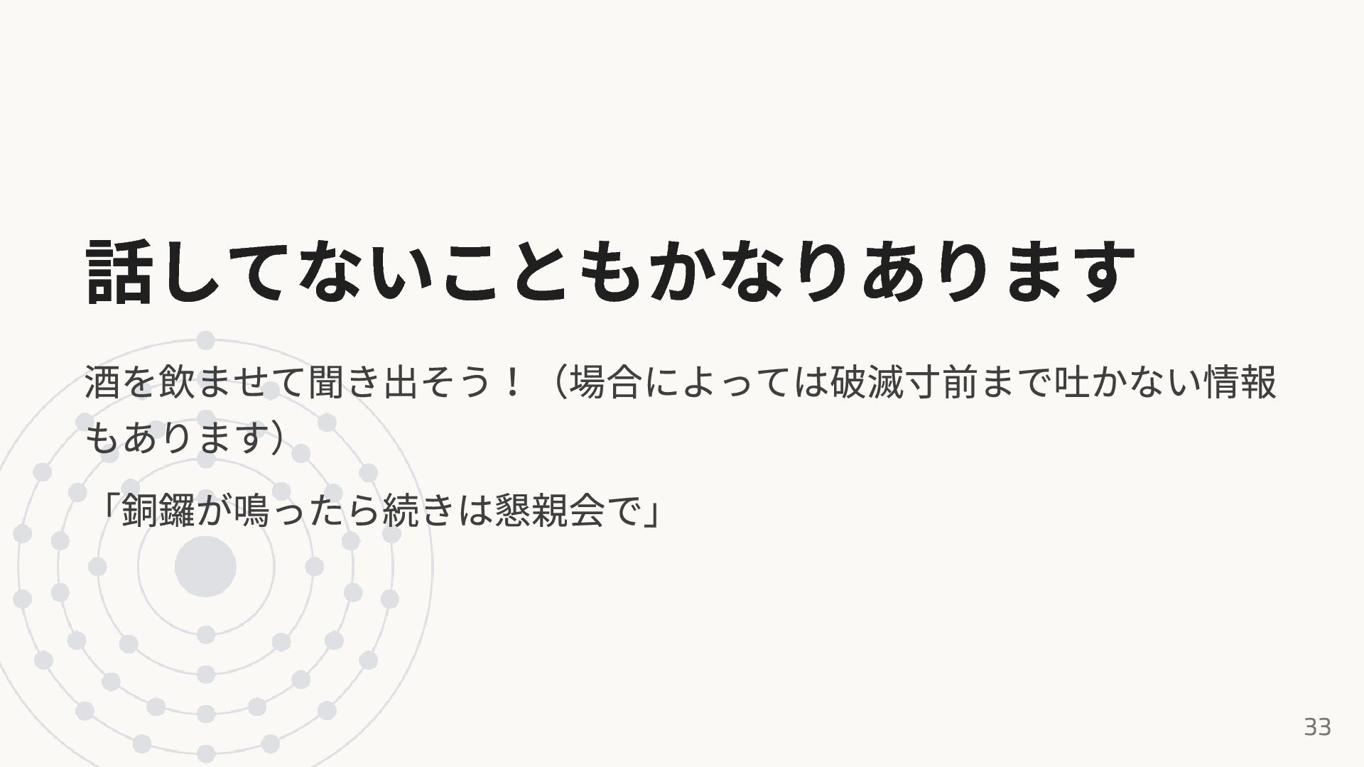 話してないこともかなりあります 酒を飲ませて聞き出そう!(場合によっては破滅寸前まで吐かない情報 もあります) 「銅鑼が鳴ったら続きは懇親会で」 33