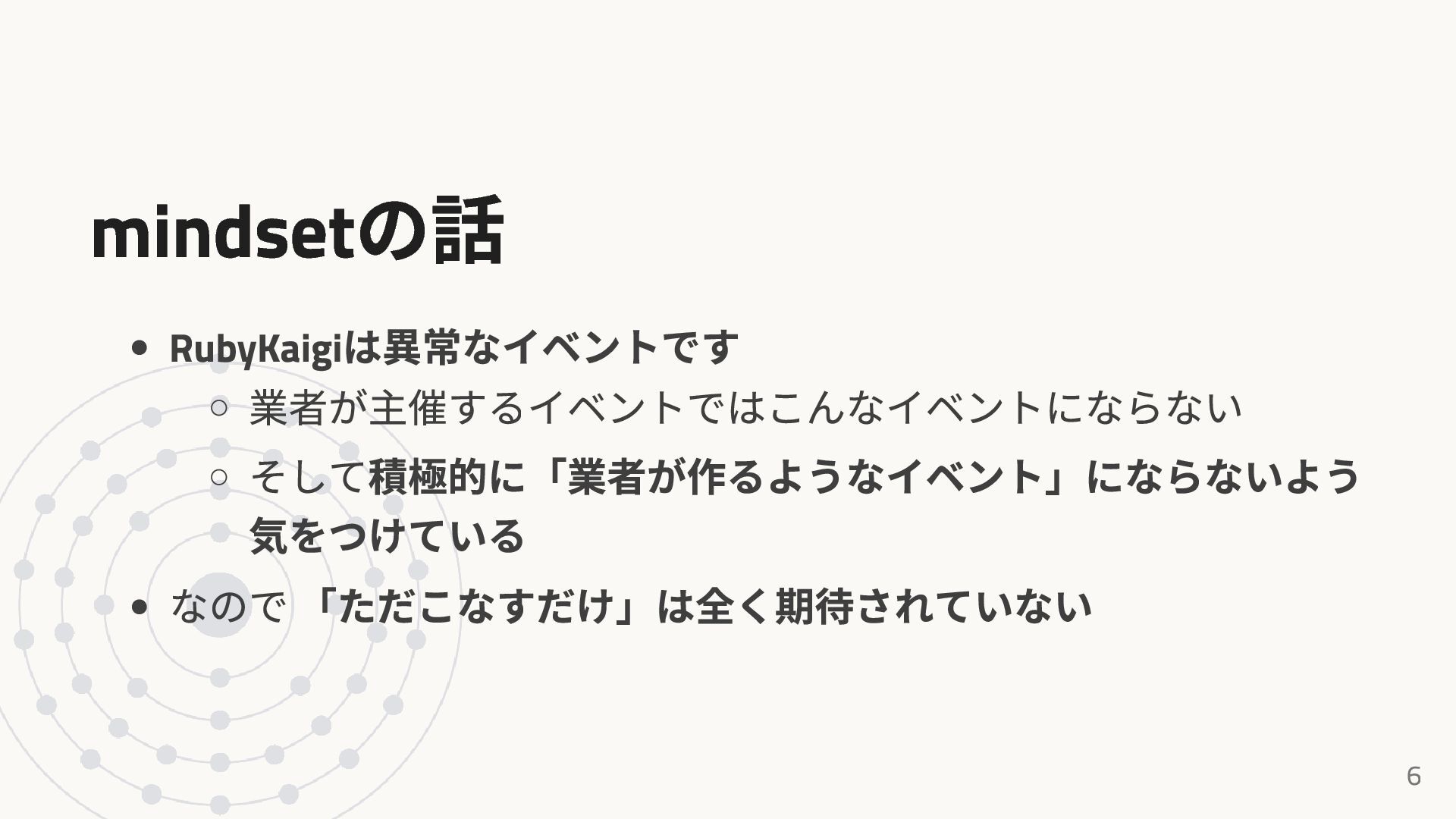 mindsetの話 RubyKaigiは異常なイベントです 業者が主催するイベントではこんなイベントにならない そして積極的に「業者が作るようなイベント」にならないよう 気をつけている なので 「ただこなすだけ」は全く期待されていない 6