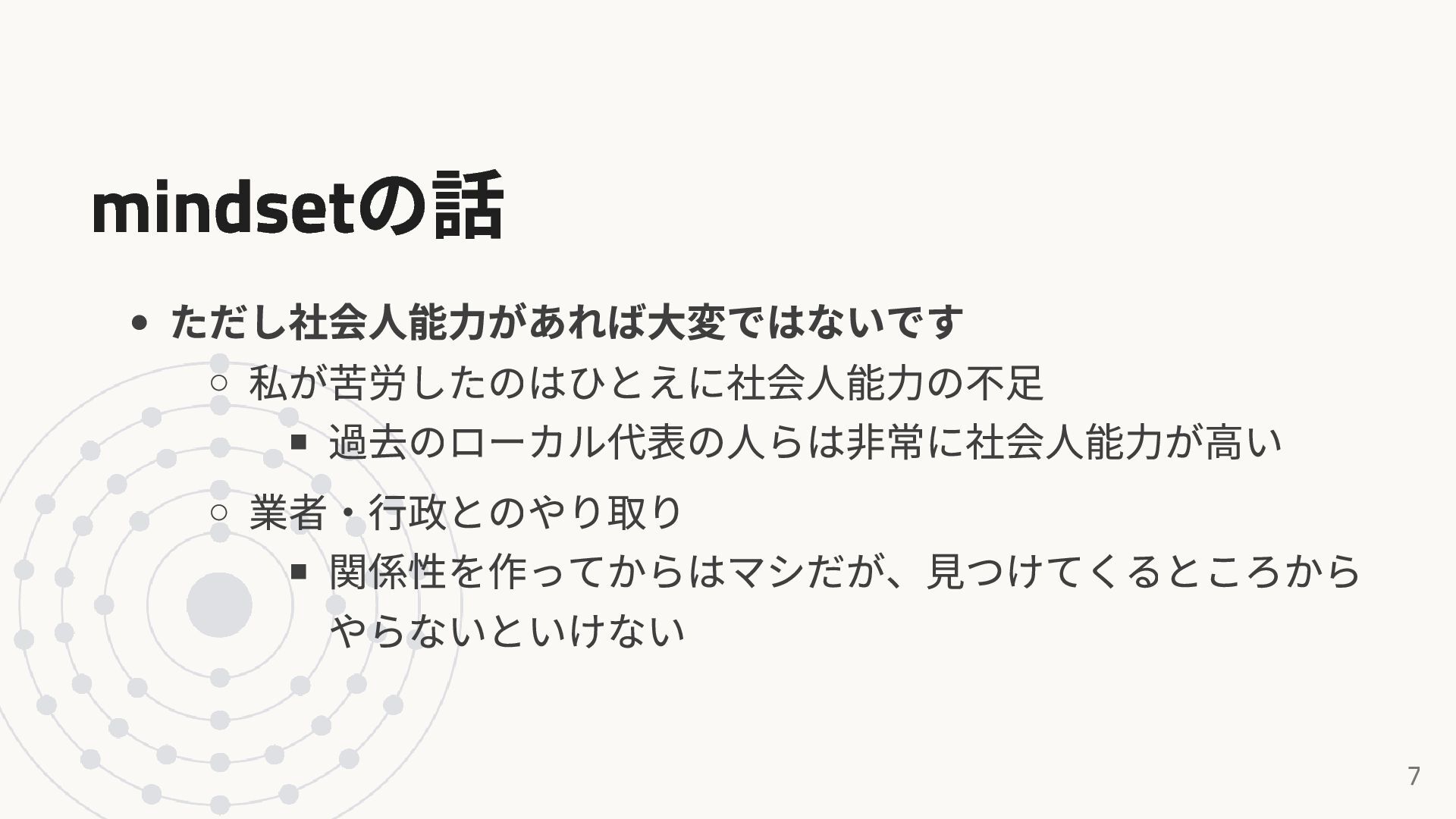 mindsetの話 ただし社会人能力があれば大変ではないです 私が苦労したのはひとえに社会人能力の不足 過去のローカル代表の人らは非常に社会人能力が高い 業者・行政とのやり取り 関係性を作ってからはマシだが、見つけてくるところから やらないといけない 7