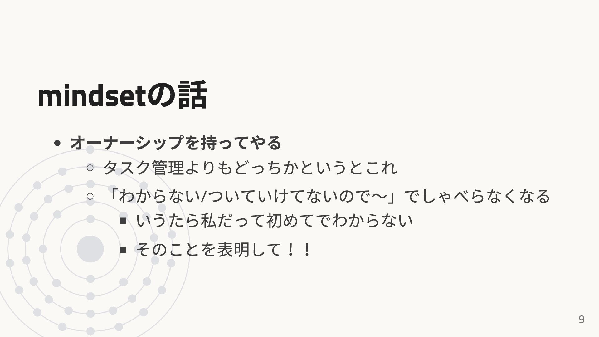 mindsetの話 オーナーシップを持ってやる タスク管理よりもどっちかというとこれ 「わからない/ついていけてないので〜」でしゃべらなくなる いうたら私だって初めてでわからない そのことを表明して!! 9