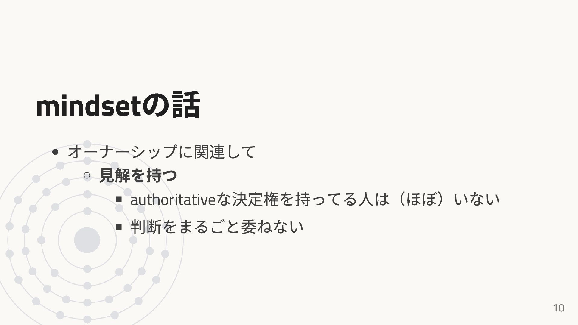 mindsetの話 オーナーシップに関連して 見解を持つ authoritativeな決定権を持ってる人は(ほぼ)いない 判断をまるごと委ねない 10