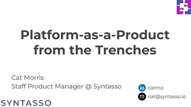 everyone all at once. 2. Platforms don’t have a very big captive audience. 3. You need to learn UX. Platform XDs are even rarer than you are. 4. FEASIBILITY IS NOT YOUR JOB ANYMORE! 5. Teams not directly adding customer value are the first to be cut. Cat’s Platform-as-a-Product Lessons