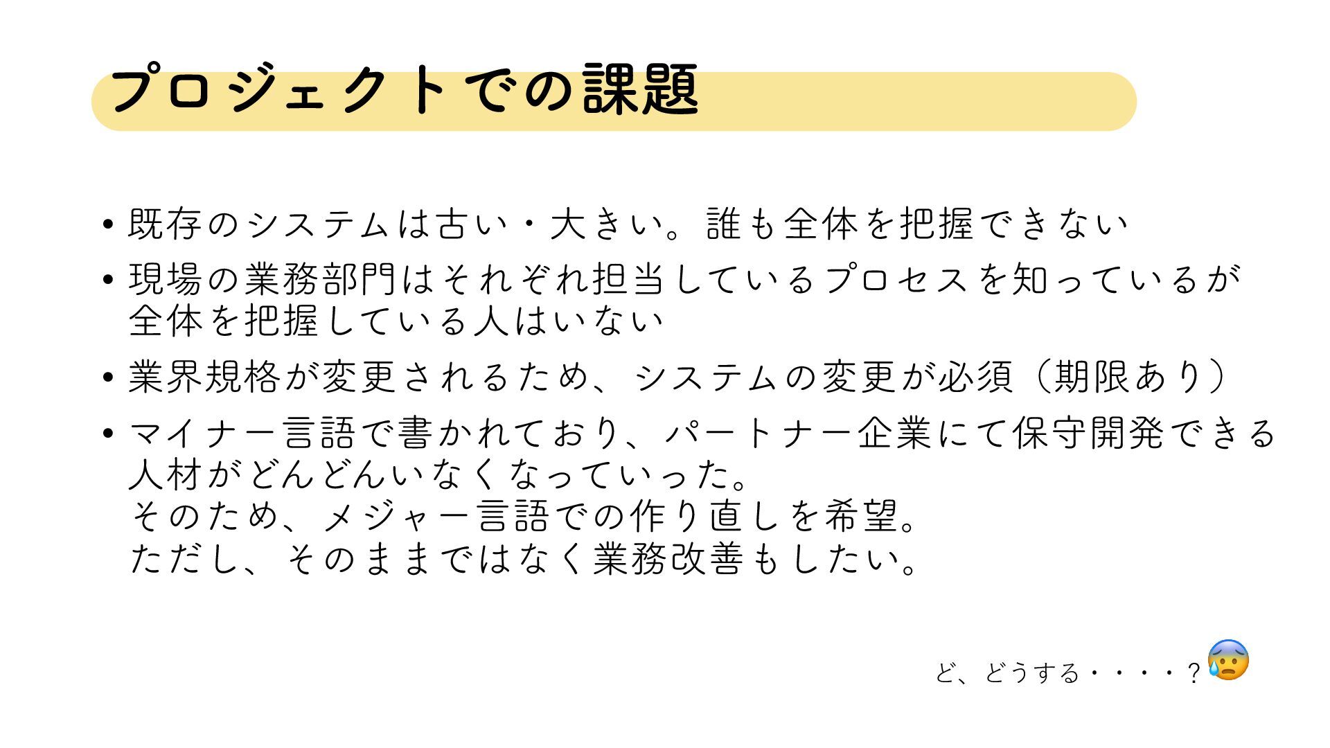 ϓϩδΣΫτͰͷ՝ • طଘͷγεςϜݹ͍ɾେ͖͍ɻ୭શମΛѲͰ͖ͳ͍ • ݱͷۀ෦ͦΕͧΕ୲͍ͯ͠ΔϓϩηεΛ͍ͬͯΔ͕ શମΛѲ͍ͯ͠Δਓ͍ͳ͍ • ۀքن͕֨มߋ͞ΕΔͨΊɺγεςϜͷมߋ͕ඞਢʢظݶ͋Γʣ • ϚΠφʔݴޠͰॻ͔Ε͓ͯΓɺύʔτφʔاۀʹͯอक։ൃͰ͖Δ