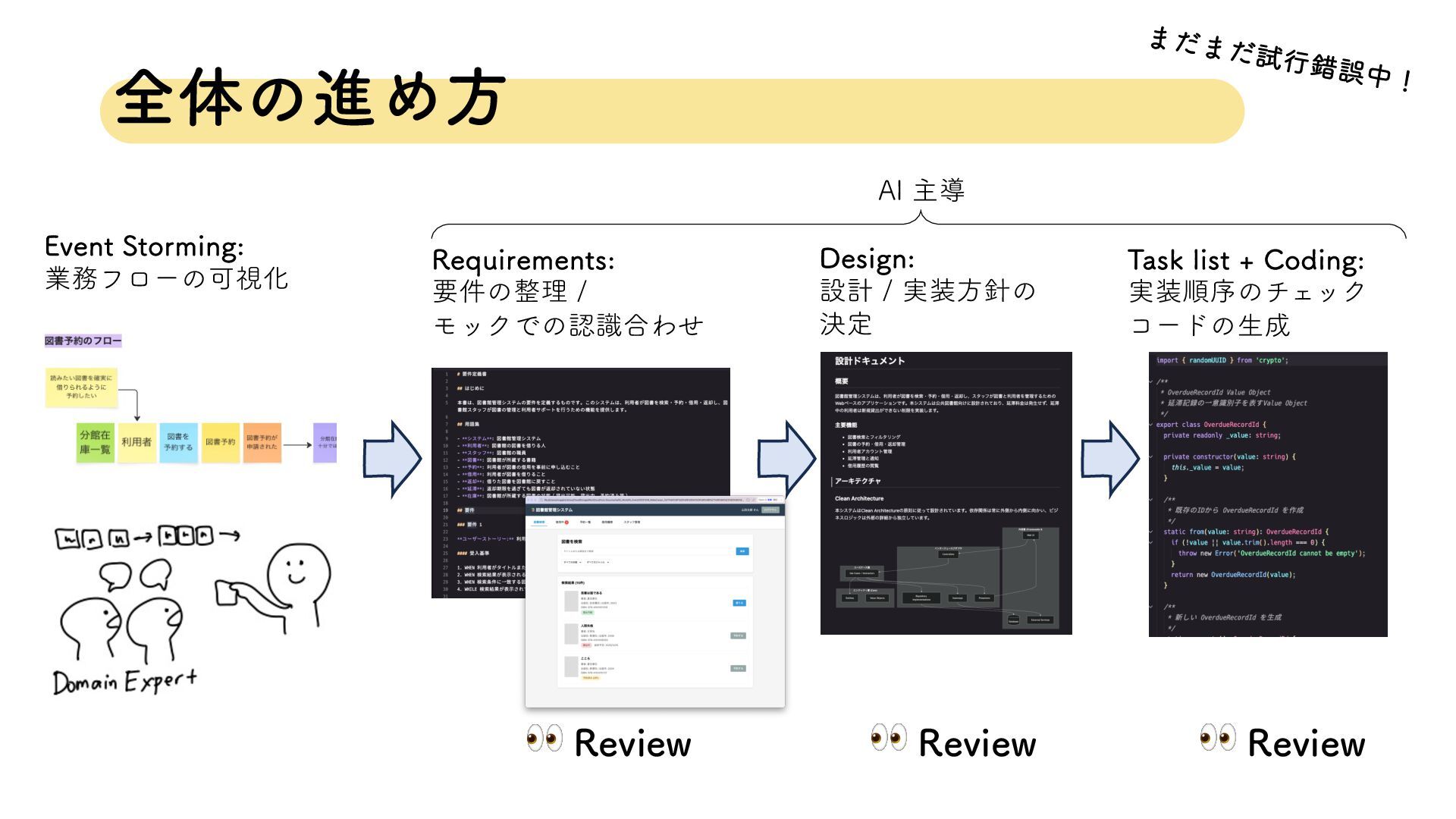 %FTJHO ઃܭ ࣮ํͷ ܾఆ 5BTLMJTU $PEJOH ࣮ॱংͷνΣοΫ ίʔυͷੜ 👀 3FWJFX 👀 3FWJFX "*ओಋ