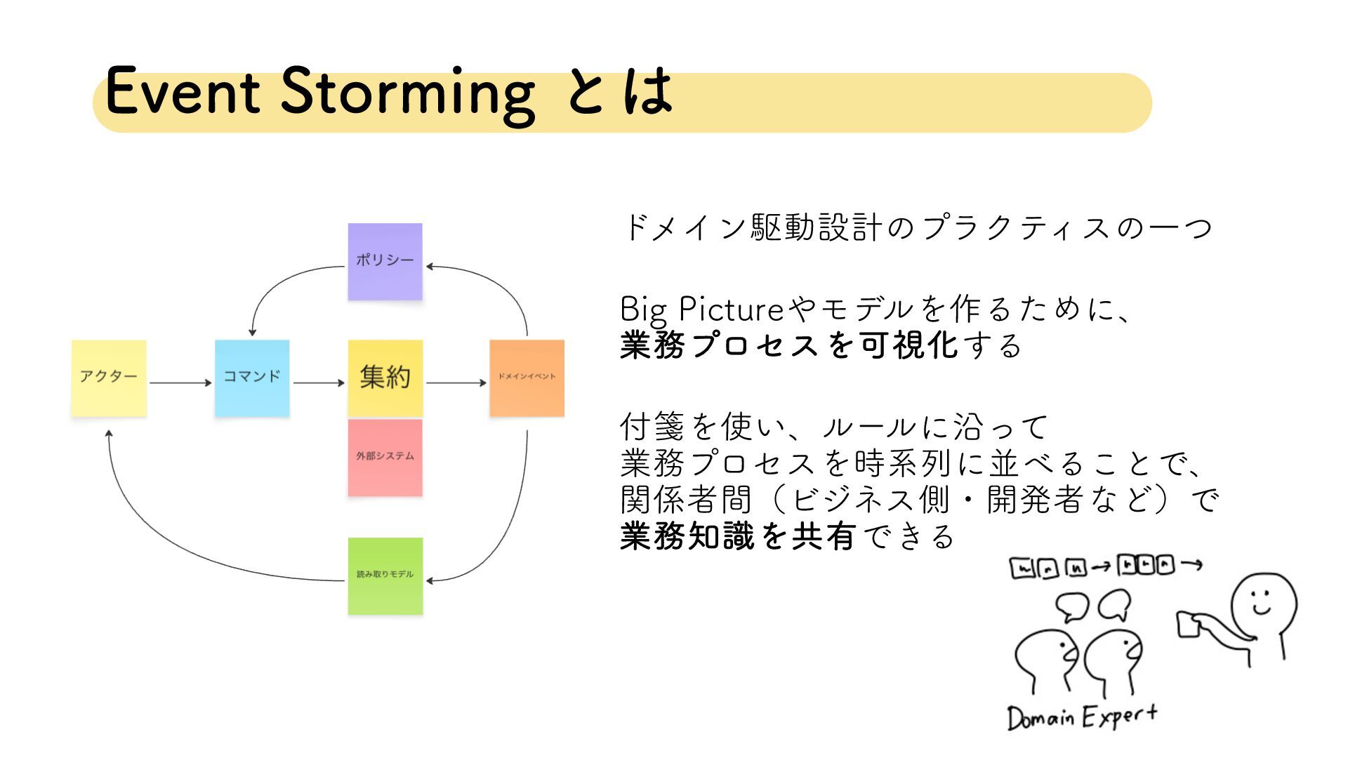 υϝΠϯۦಈઃܭ %%% ͱ υϝΠϯۦಈઃܭͰɺϏδωεαΠυͱ։ൃऀ͕ ಉ͡ݴ༿ΛͬͯۀΛཧղ͠ɺڞ௨ೝࣝΛ࡞͍ͬͯ͘ɻ &WFOU4UPSNJOHͦͷϓϥΫςΟεͷҰͭ ϏδωεΛཧղ͠ɺͦΕΛਖ਼͘͠Ϟσϧɾίʔυʹ͢Δ ۀΛదͳղͰɺؔ৺͝ͱ͕͔ΕΔΑ͏ʹׂͯ͠ γεςϜͷൣғΛ໌֬ʹ۠Δ ࢀߟ͠ΐ΅ϊʔτ