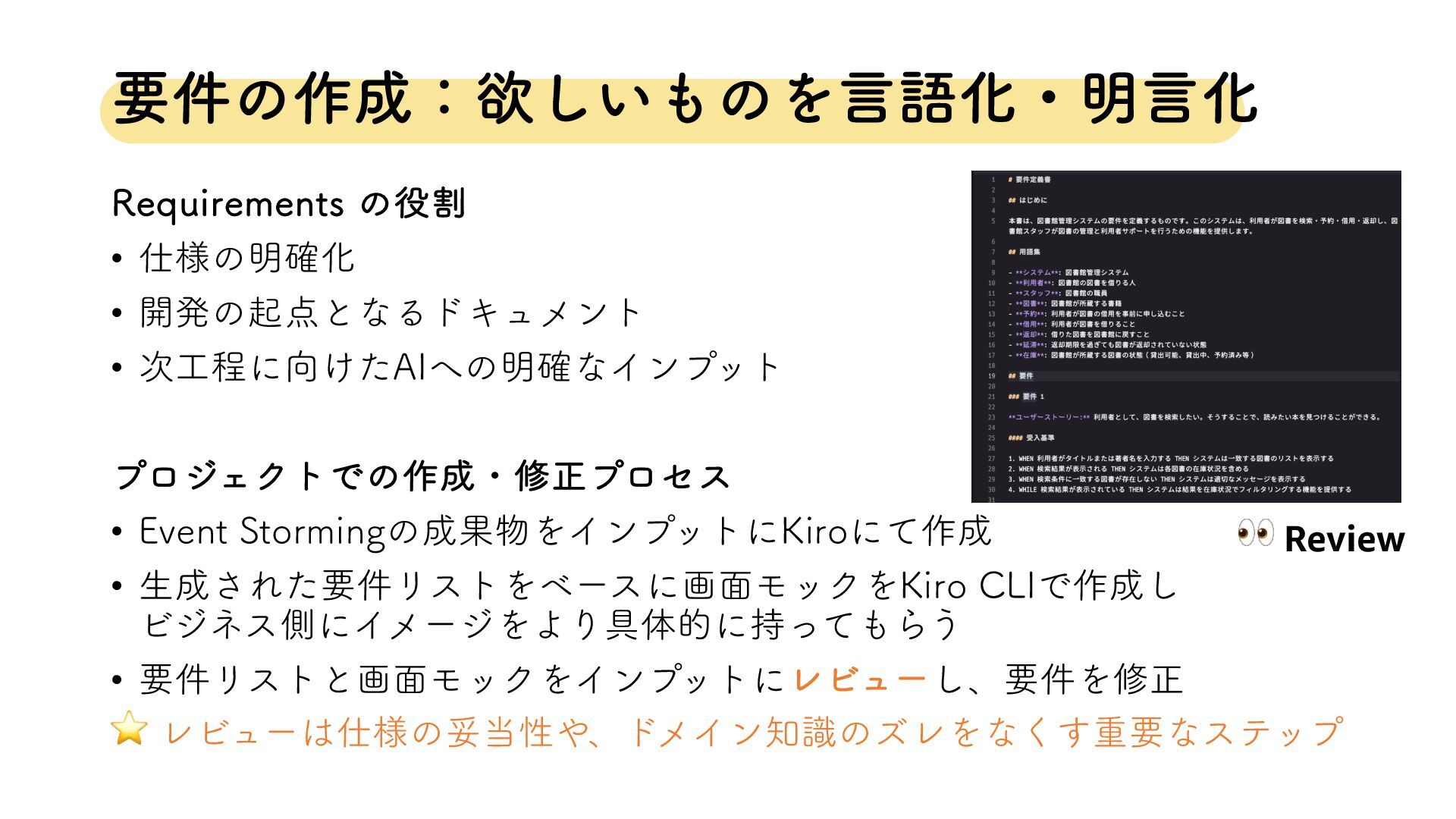 શମͷਐΊํ ·ͩ·ͩࢼߦࡨޡதʂ &WFOU4UPSNJOH ۀϑϩʔͷՄࢹԽ 3FRVJSFNFOUT ཁ݅ͷཧ ϞοΫͰͷೝࣝ߹Θͤ 👀 3FWJFX