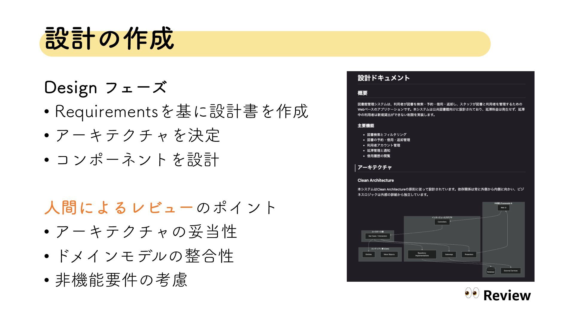 ઃܭͷ࡞ %FTJHOϑΣʔζ • 3FRVJSFNFOUTΛجʹઃܭॻΛ࡞ • ΞʔΩςΫνϟΛܾఆ • ίϯϙʔωϯτΛઃܭ ਓؒʹΑΔϨϏϡʔͷϙΠϯτ •