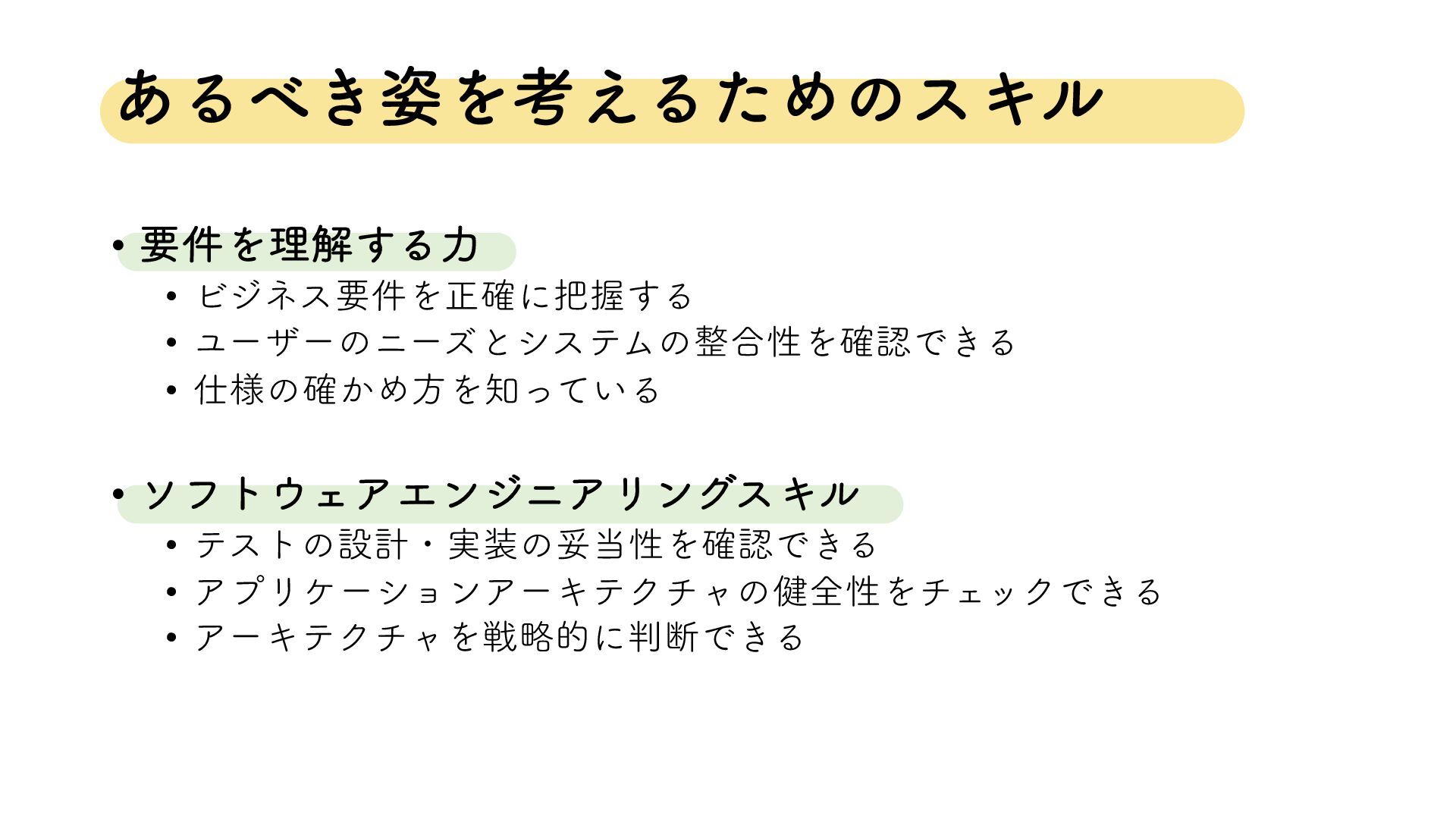 ͋Δ͖࢟Λߟ͑ΔͨΊͷεΩϧ • ཁ݅Λཧղ͢Δྗ • Ϗδωεཁ݅Λਖ਼֬ʹѲ͢Δ • ϢʔβʔͷχʔζͱγεςϜͷ߹ੑΛ֬ೝͰ͖Δ • ༷ͷ͔֬ΊํΛ͍ͬͯΔ •