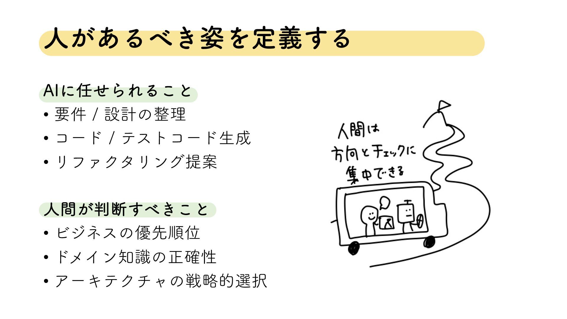 ਓ͕͋Δ͖࢟Λఆٛ͢Δ "*ʹͤΒΕΔ͜ͱ • ཁ݅ ઃܭͷཧ • ίʔυ ςετίʔυੜ • ϦϑΝΫλϦϯάఏҊ