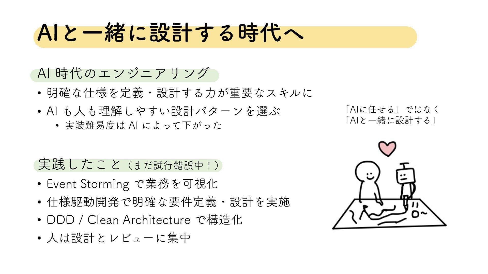 • &WFOU4UPSNJOHͰۀΛՄࢹԽ • ༷ۦಈ։ൃͰ໌֬ͳཁ݅ఆٛɾઃܭΛ࣮ࢪ • %%%$MFBO"SDIJUFDUVSFͰߏԽ • ਓઃܭͱϨϏϡʔʹूத ʮ"*ʹͤΔʯͰͳ͘ ʮ"*ͱҰॹʹઃܭ͢Δʯ