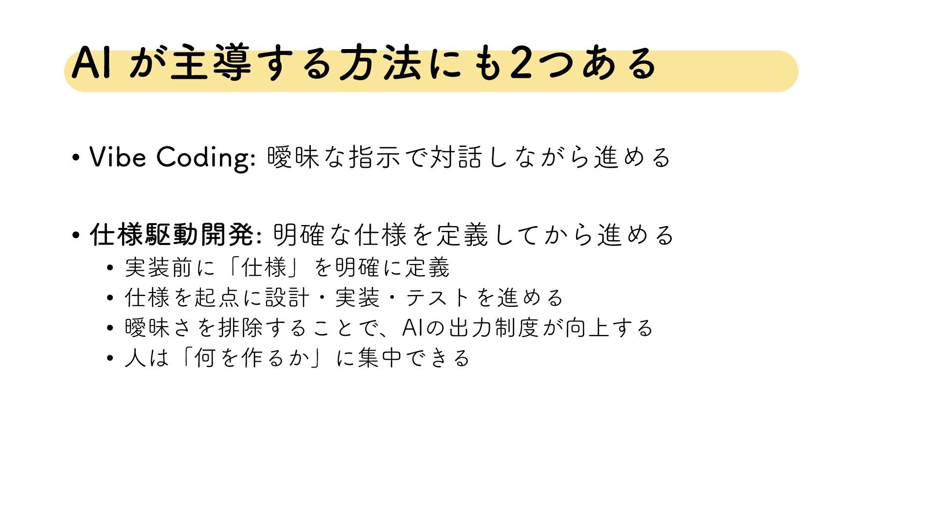 "*͕ओಋ͢Δํ๏ʹͭ͋Δ • 7JCF$PEJOH ᐆດͳࢦࣔͰର͠ͳ͕ΒਐΊΔ • ༷ۦಈ։ൃ ໌֬ͳ༷Λఆ͔ٛͯ͠ΒਐΊΔ • ࣮લʹʮ༷ʯΛ໌֬ʹఆٛ •