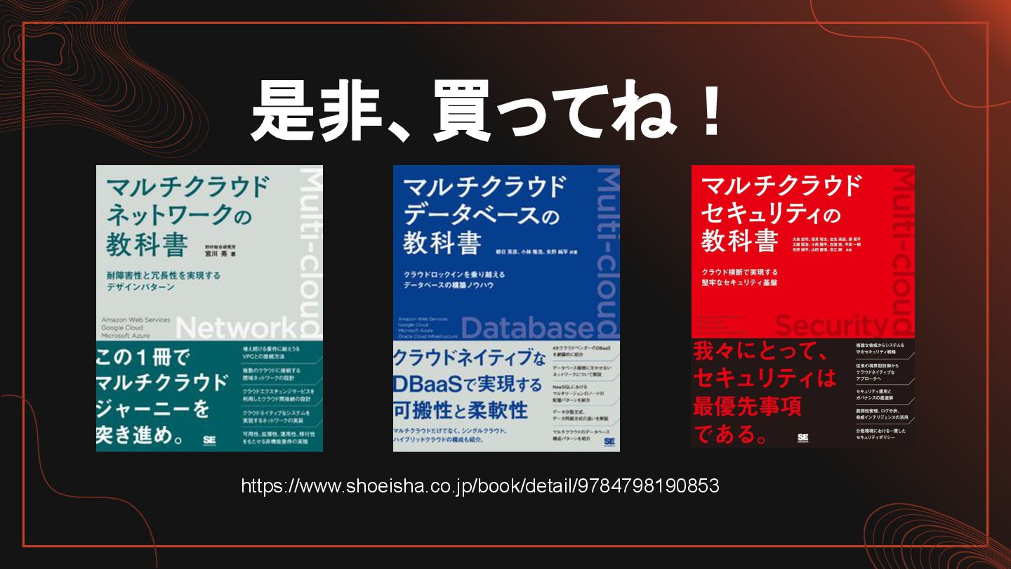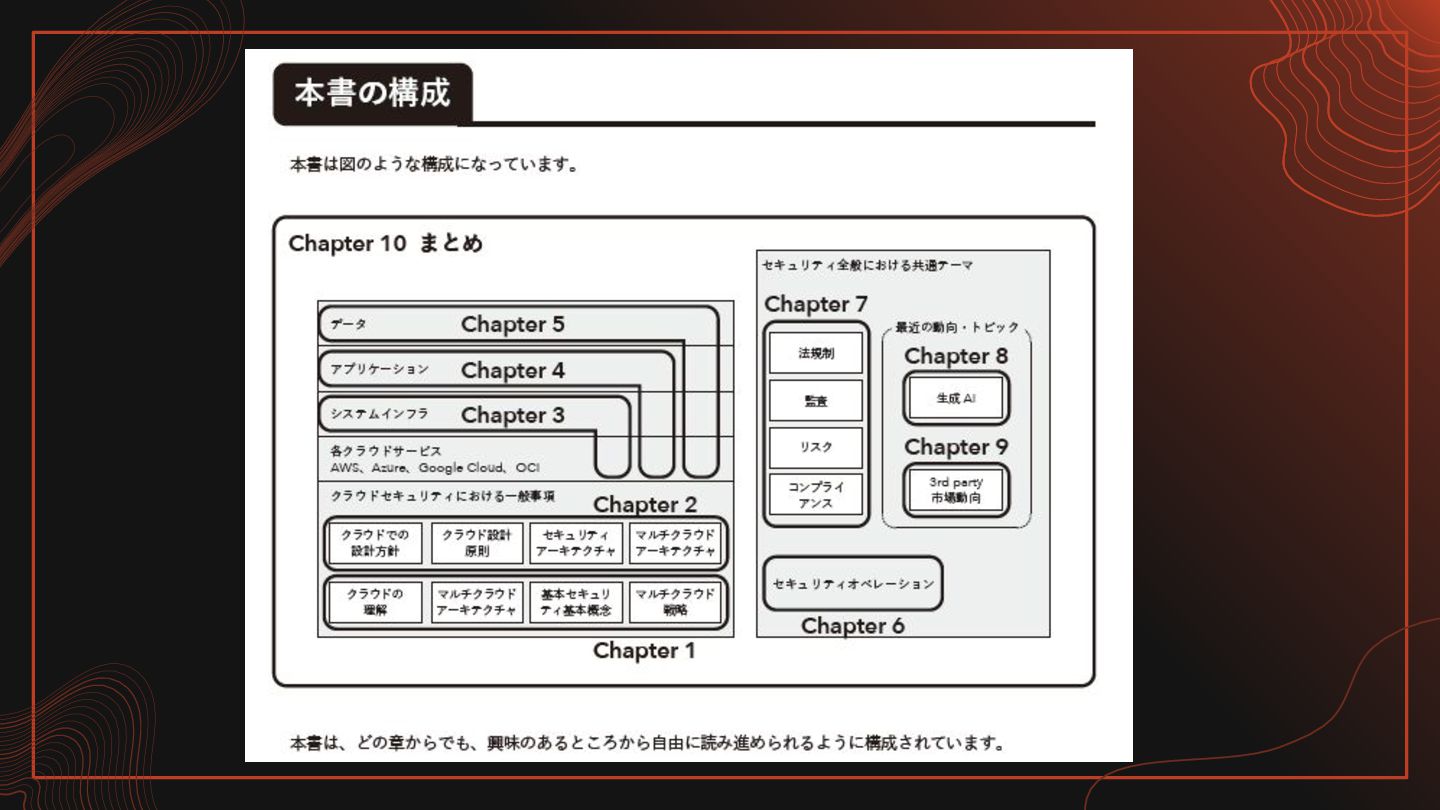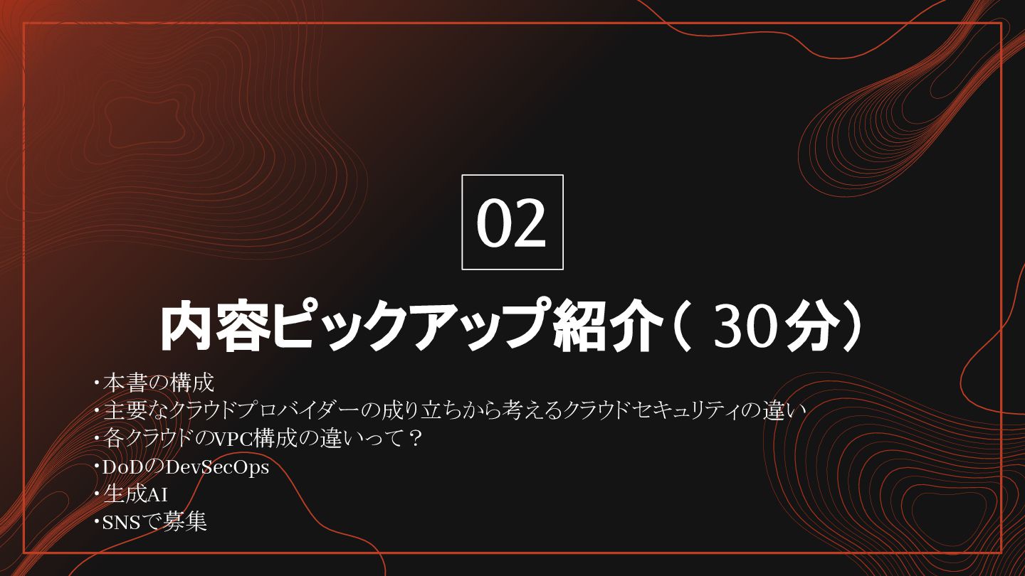 内容ピックアップ紹介( 30分) 02 ・本書の構成 ・主要なクラウドプロバイダーの成り立ちから考えるクラウドセキュリティの違い ・各クラウドのVPC構成の違いって? ・DoDのDevSecOps ・生成AI ・SNSで募集