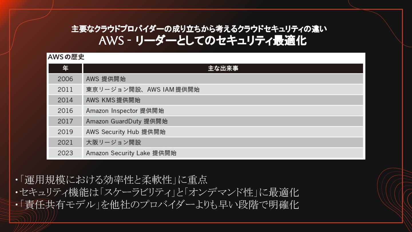 主要なクラウドプロバイダーの成り立ちから考えるクラウドセキュリティの違い AWS - リーダーとしてのセキュリティ最適化 ・「運用規模における効率性と柔軟性」に重点 ・セキュリティ機能は「スケーラビリティ」と「オンデマンド性」に最適化 ・「責任共有モデル」を他社のプロバイダーよりも早い段階で明確化
