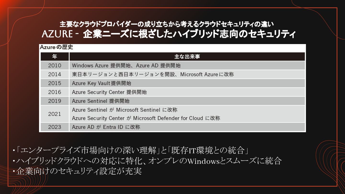 主要なクラウドプロバイダーの成り立ちから考えるクラウドセキュリティの違い AZURE - 企業ニーズに根ざしたハイブリッド志向のセキュリティ ・「エンタープライズ市場向けの深い理解」と「既存IT環境との統合」 ・ハイブリッドクラウドへの対応に特化、オンプレのWindowsとスムーズに統合 ・企業向けのセキュリティ設定が充実