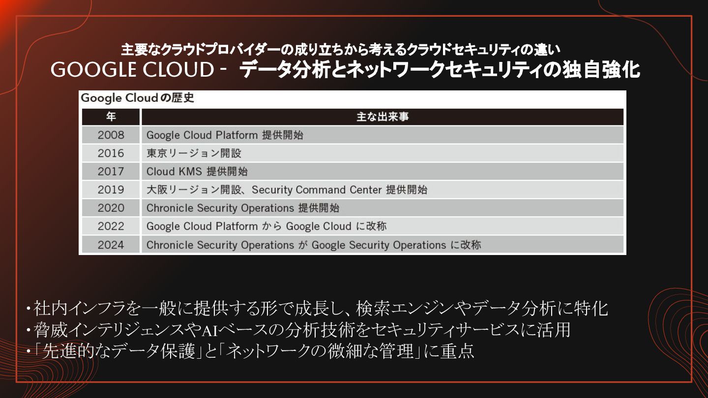 主要なクラウドプロバイダーの成り立ちから考えるクラウドセキュリティの違い GOOGLE CLOUD - データ分析とネットワークセキュリティの独自強化 ・社内インフラを一般に提供する形で成長し、検索エンジンやデータ分析に特化 ・脅威インテリジェンスやAIベースの分析技術をセキュリティサービスに活用 ・「先進的なデータ保護」と「ネットワークの微細な管理」に重点