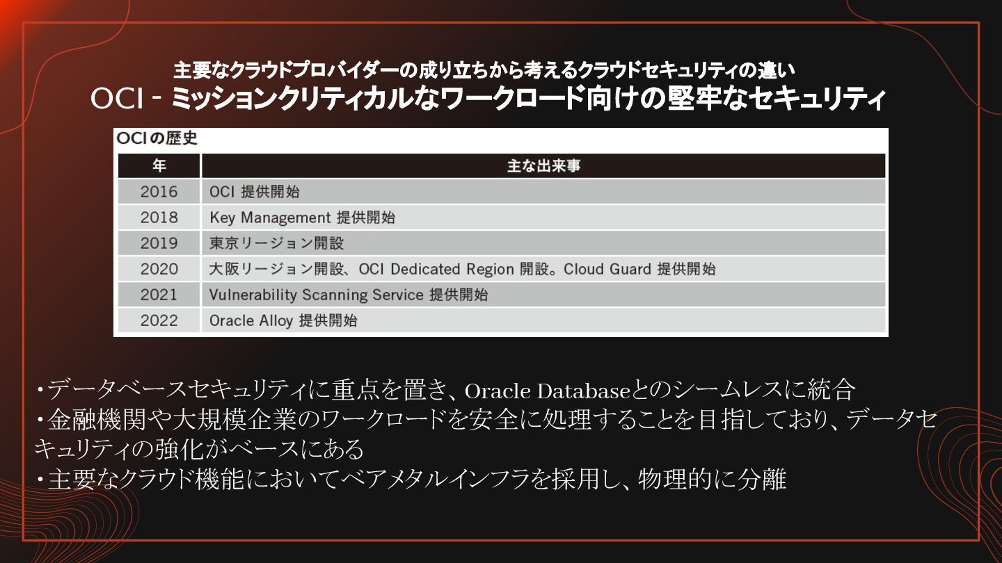 主要なクラウドプロバイダーの成り立ちから考えるクラウドセキュリティの違い OCI - ミッションクリティカルなワークロード向けの堅牢なセキュリティ ・データベースセキュリティに重点を置き、Oracle Databaseとのシームレスに統合 ・金融機関や大規模企業のワークロードを安全に処理することを目指しており、データセ キュリティの強化がベースにある ・主要なクラウド機能においてベアメタルインフラを採用し、物理的に分離