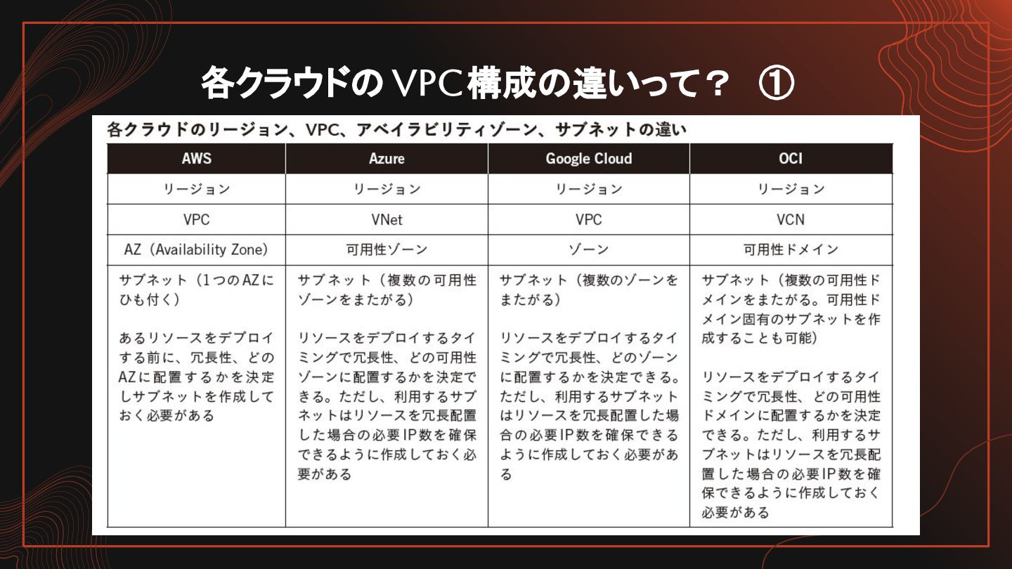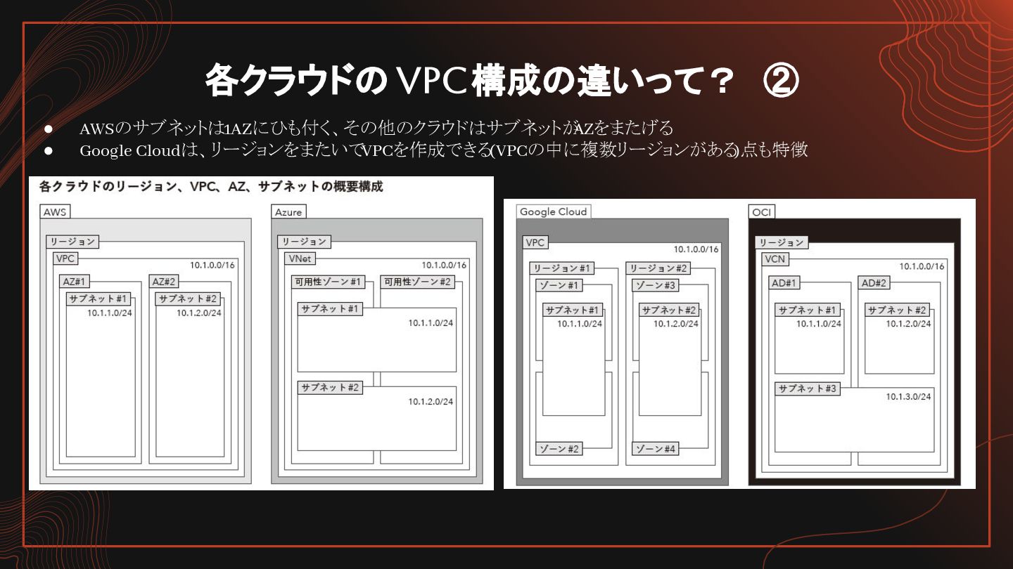 各クラウドの VPC構成の違いって? ② • AWSのサブネットは1AZにひも付く、その他のクラウドはサブネットが AZをまたげる • Google Cloudは、リージョンをまたいでVPCを作成できる(VPCの中に複数リージョンがある )点も特徴