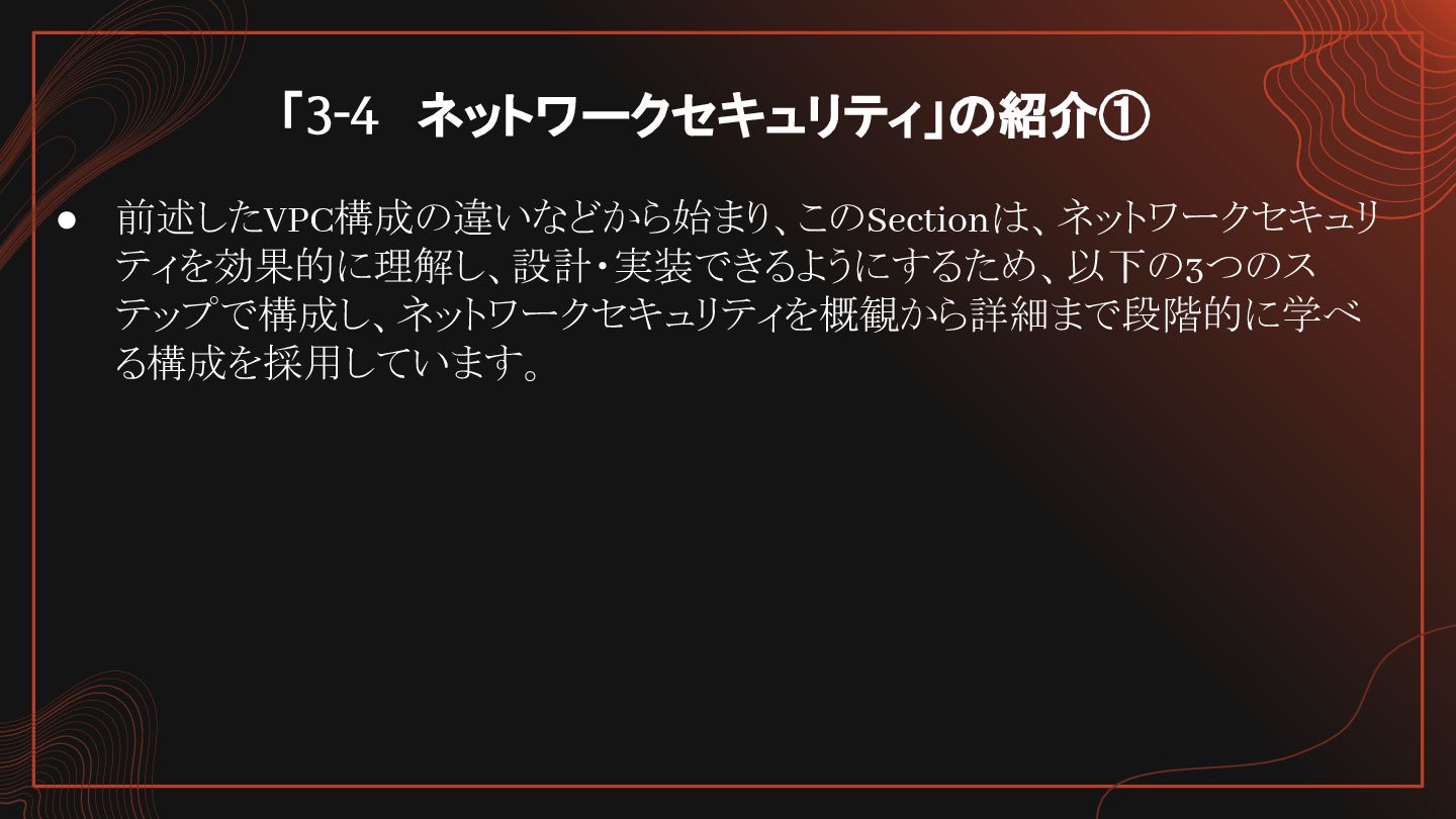 「3-4 ネットワークセキュリティ」の紹介① • 前述したVPC構成の違いなどから始まり、このSectionは、ネットワークセキュリ ティを効果的に理解し、設計・実装できるようにするため、以下の3つのス テップで構成し、ネットワークセキュリティを概観から詳細まで段階的に学べ る構成を採用しています。