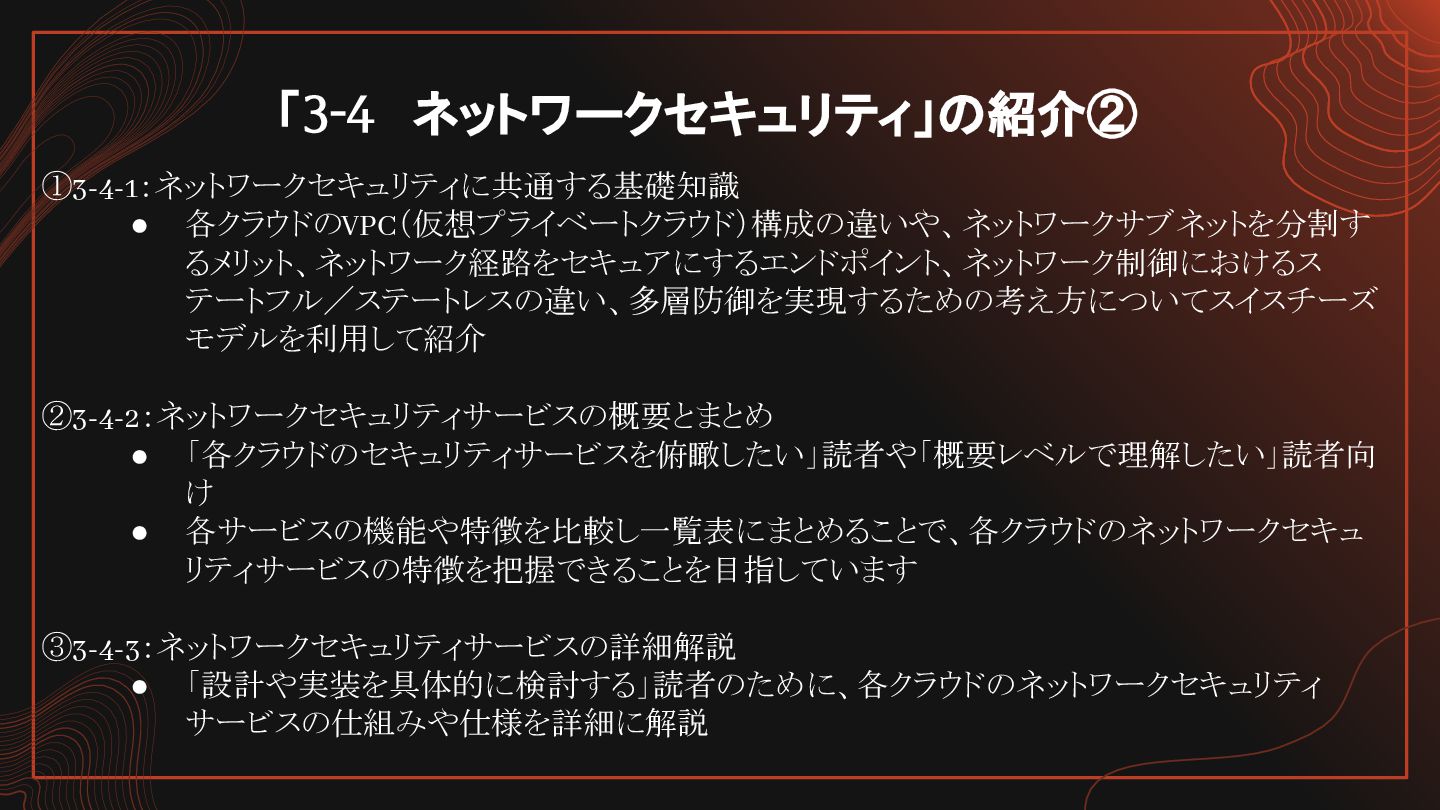 「3-4 ネットワークセキュリティ」の紹介② ①3-4-1:ネットワークセキュリティに共通する基礎知識 • 各クラウドのVPC(仮想プライベートクラウド)構成の違いや、ネットワークサブネットを分割す るメリット、ネットワーク経路をセキュアにするエンドポイント、ネットワーク制御におけるス テートフル/ステートレスの違い、多層防御を実現するための考え方についてスイスチーズ モデルを利用して紹介 ②3-4-2:ネットワークセキュリティサービスの概要とまとめ • 「各クラウドのセキュリティサービスを俯瞰したい」読者や「概要レベルで理解したい」読者向