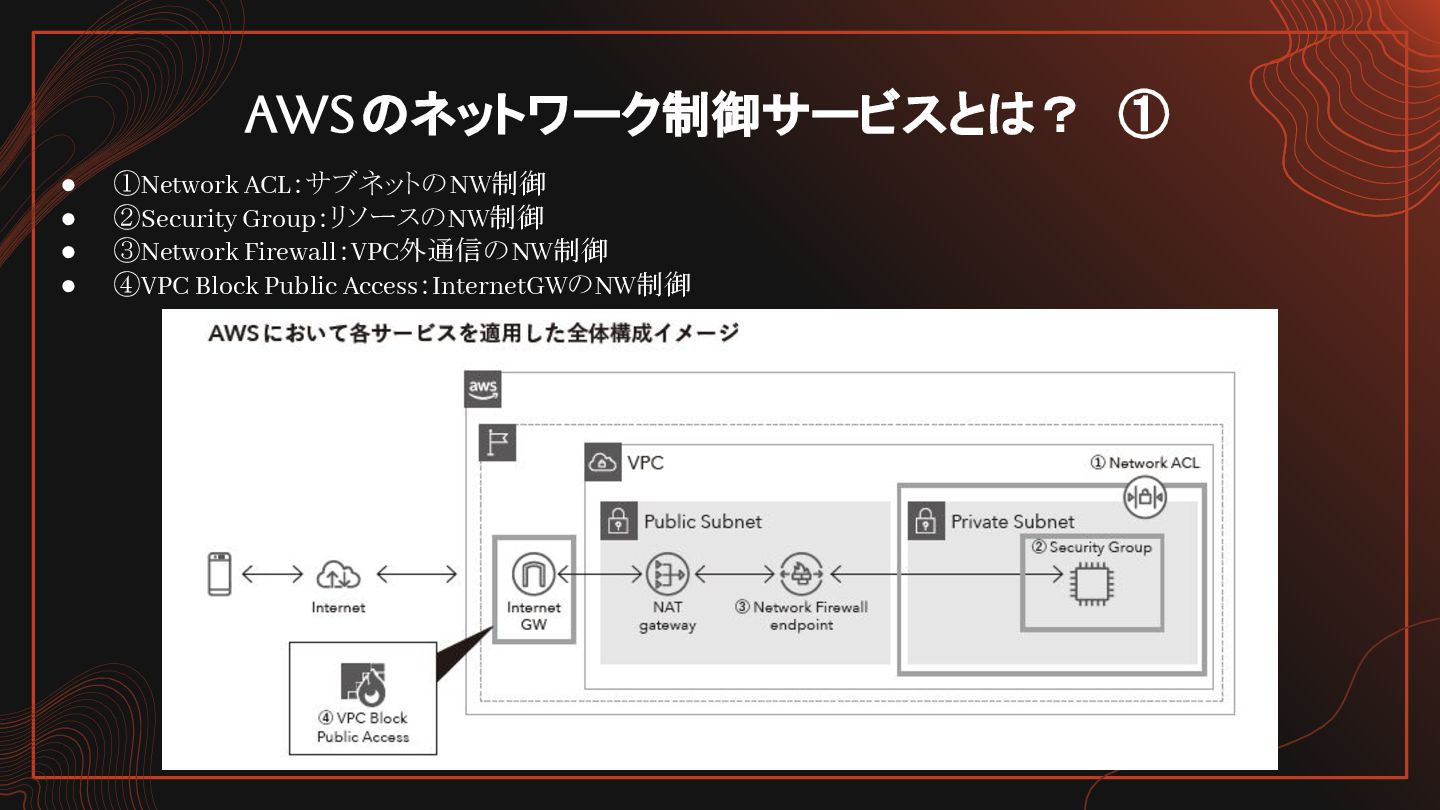 AWSのネットワーク制御サービスとは? ① • ①Network ACL:サブネットのNW制御 • ②Security Group:リソースのNW制御 • ③Network Firewall:VPC外通信のNW制御