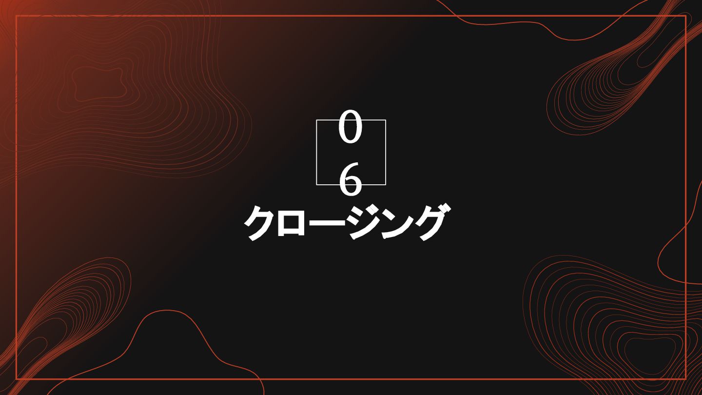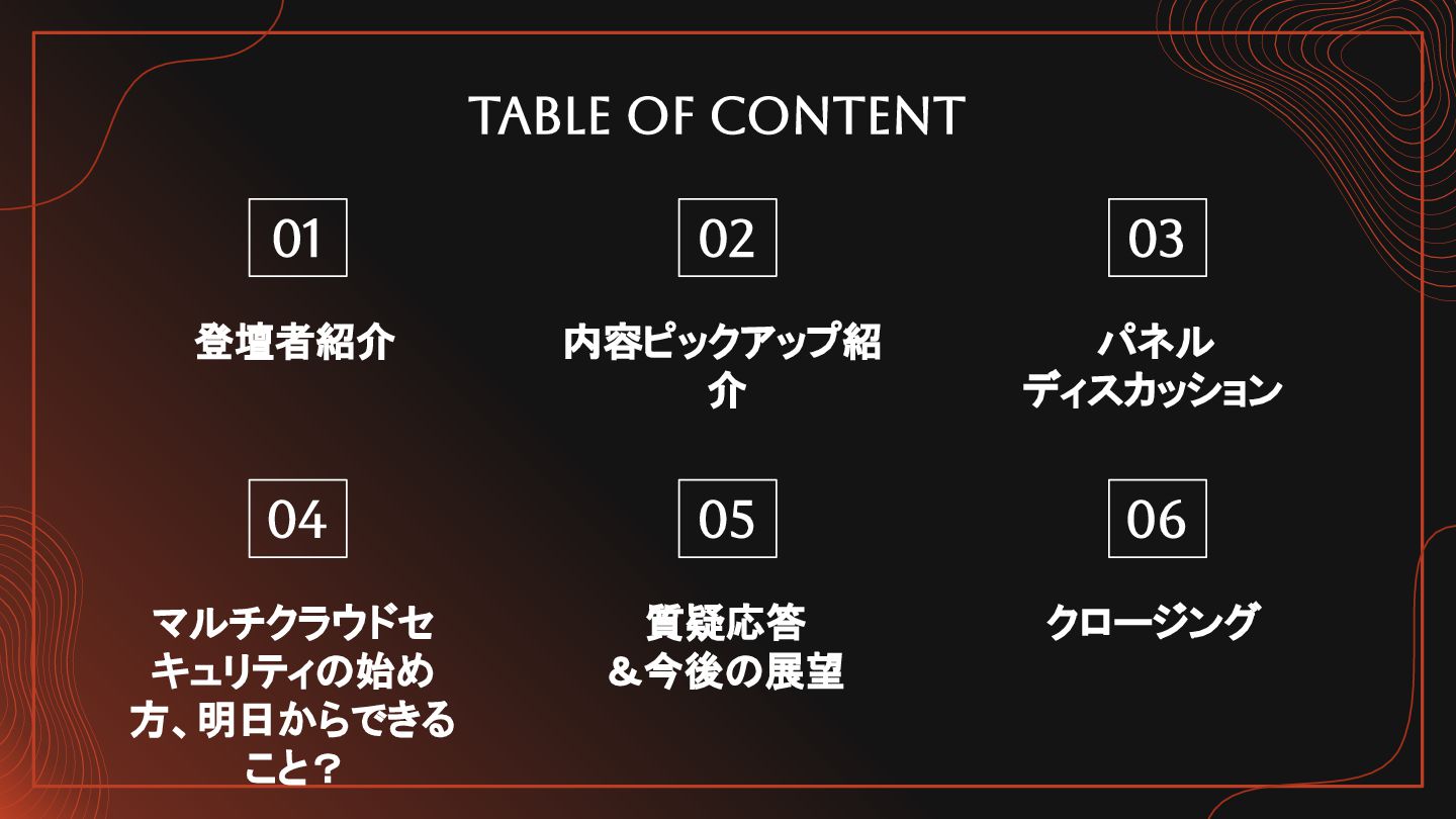TABLE OF CONTENT 01 04 02 05 03 06 登壇者紹介