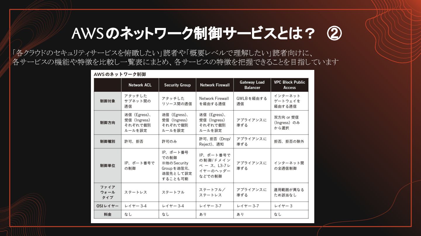 AWSのネットワーク制御サービスとは? ② 「各クラウドのセキュリティサービスを俯瞰したい」読者や「概要レベルで理解したい」読者向けに、 各サービスの機能や特徴を比較し一覧表にまとめ、各サービスの特徴を把握できることを目指しています