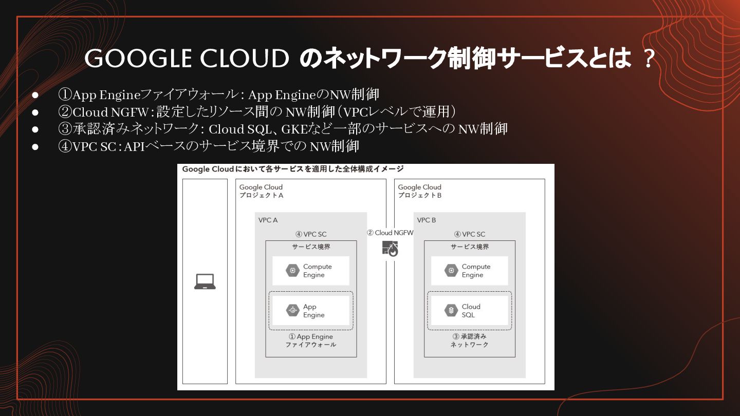 GOOGLE CLOUD のネットワーク制御サービスとは ? • ①App Engineファイアウォール:App EngineのNW制御 • ②Cloud