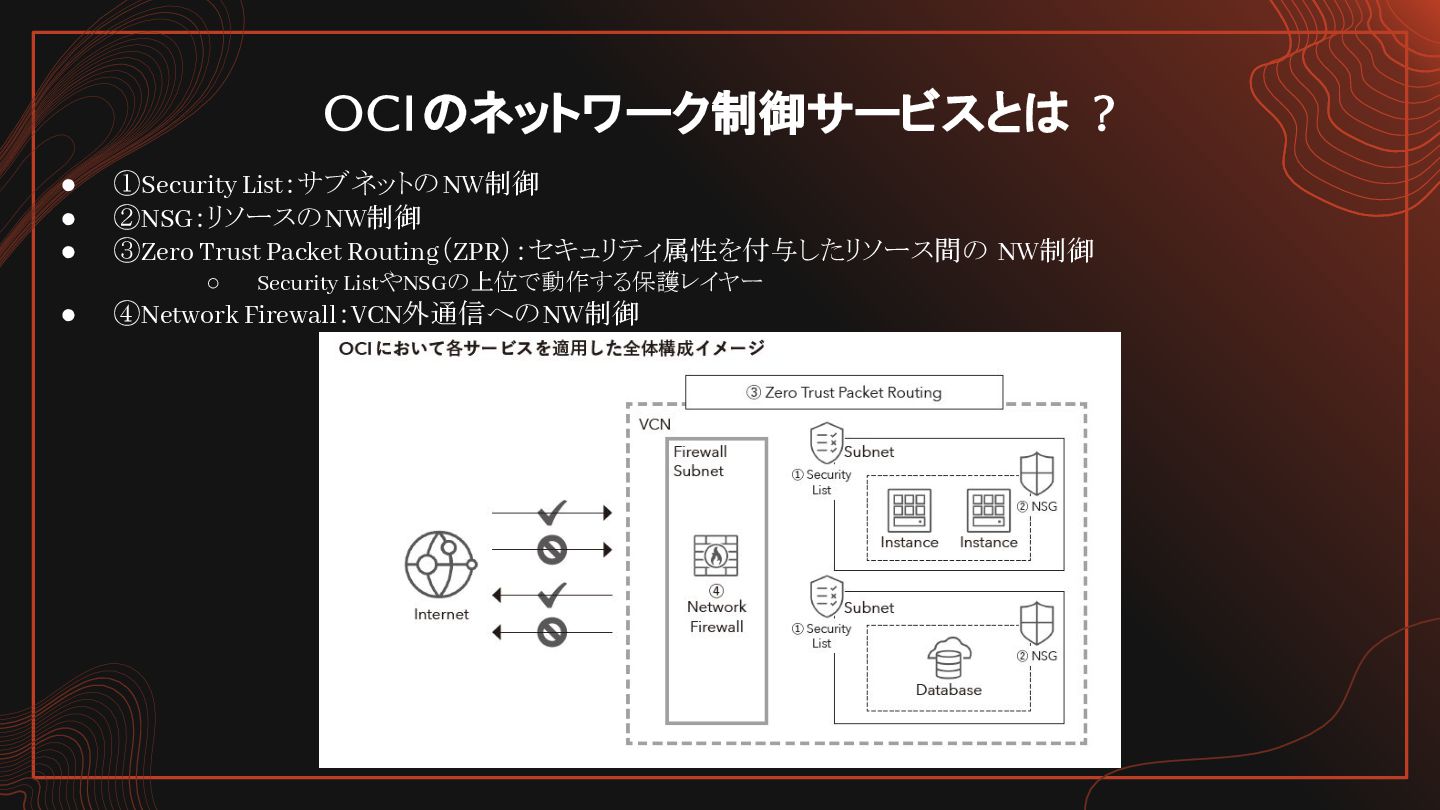 Packet Routing(ZPR):セキュリティ属性を付与したリソース間の NW制御 ◦ Security ListやNSGの上位で動作する保護レイヤー • ④Network Firewall:VCN外通信へのNW制御