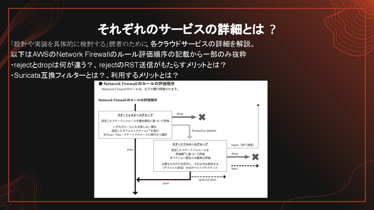 それぞれのサービスの詳細とは ? 「設計や実装を具体的に検討する」読者のために 、各クラウドサービスの詳細を解説。 以下はAWSのNetwork Firewallのルール評価順序の記載から一部のみ抜粋 ・rejectとdropは何が違う?、rejectのRST送信がもたらすメリットとは? ・Suricata互換フィルターとは?、利用するメリットとは?