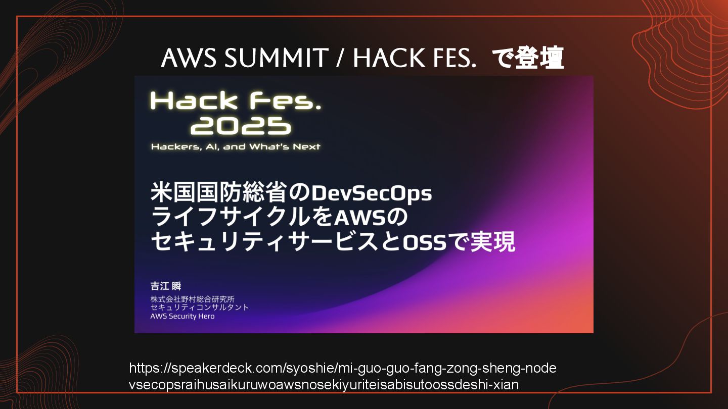 AWS SUMMiT / HACK FES. で登壇 https://speakerdeck.com/syoshie/mi-guo-guo-fang-zong-sheng-node vsecopsraihusaikuruwoawsnosekiyuriteisabisutoossdeshi-xian