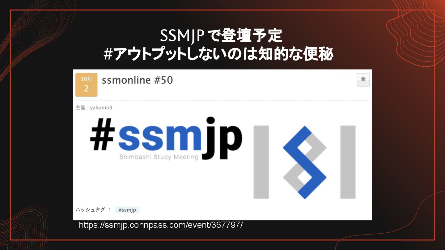 SSMJP で登壇予定 #アウトプットしないのは知的な便秘 https://ssmjp.connpass.com/event/367797/