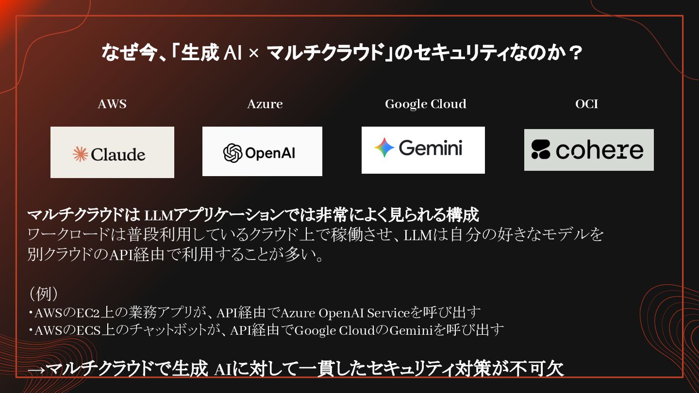 OpenAI Serviceを呼び出す ・AWSのECS上のチャットボットが、API経由でGoogle CloudのGeminiを呼び出す →マルチクラウドで生成 AIに対して一貫したセキュリティ対策が不可欠 AWS Azure Google Cloud OCI