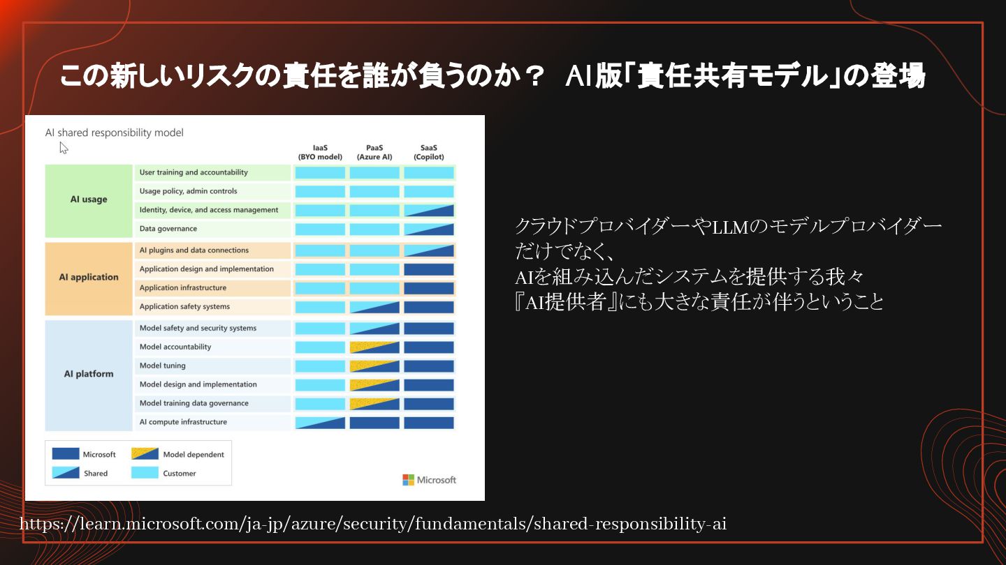 この新しいリスクの責任を誰が負うのか? AI版「責任共有モデル」の登場 クラウドプロバイダーやLLMのモデルプロバイダー だけでなく、 AIを組み込んだシステムを提供する我々 『AI提供者』にも大きな責任が伴うということ https://learn.microsoft.com/ja-jp/azure/security/fundamentals/shared-responsibility-ai