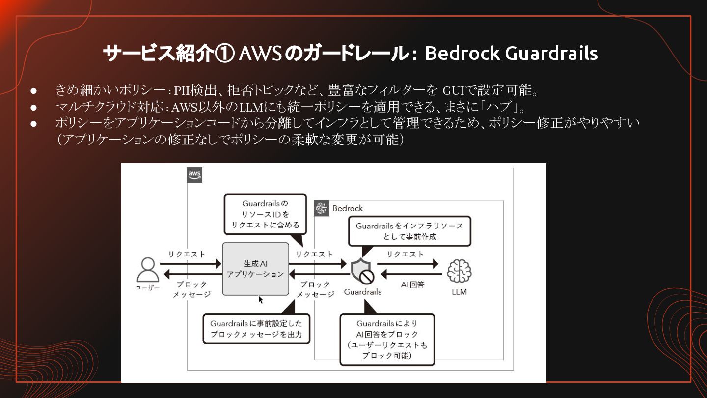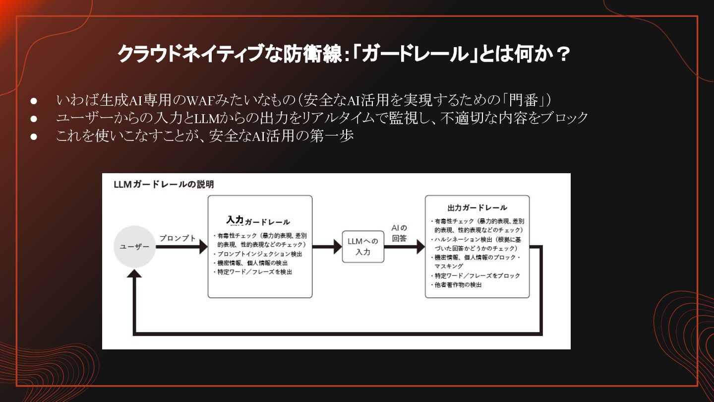 クラウドネイティブな防衛線:「ガードレール」とは何か? • いわば生成AI専用のWAFみたいなもの(安全なAI活用を実現するための「門番」) • ユーザーからの入力とLLMからの出力をリアルタイムで監視し、不適切な内容をブロック • これを使いこなすことが、安全なAI活用の第一歩 入力