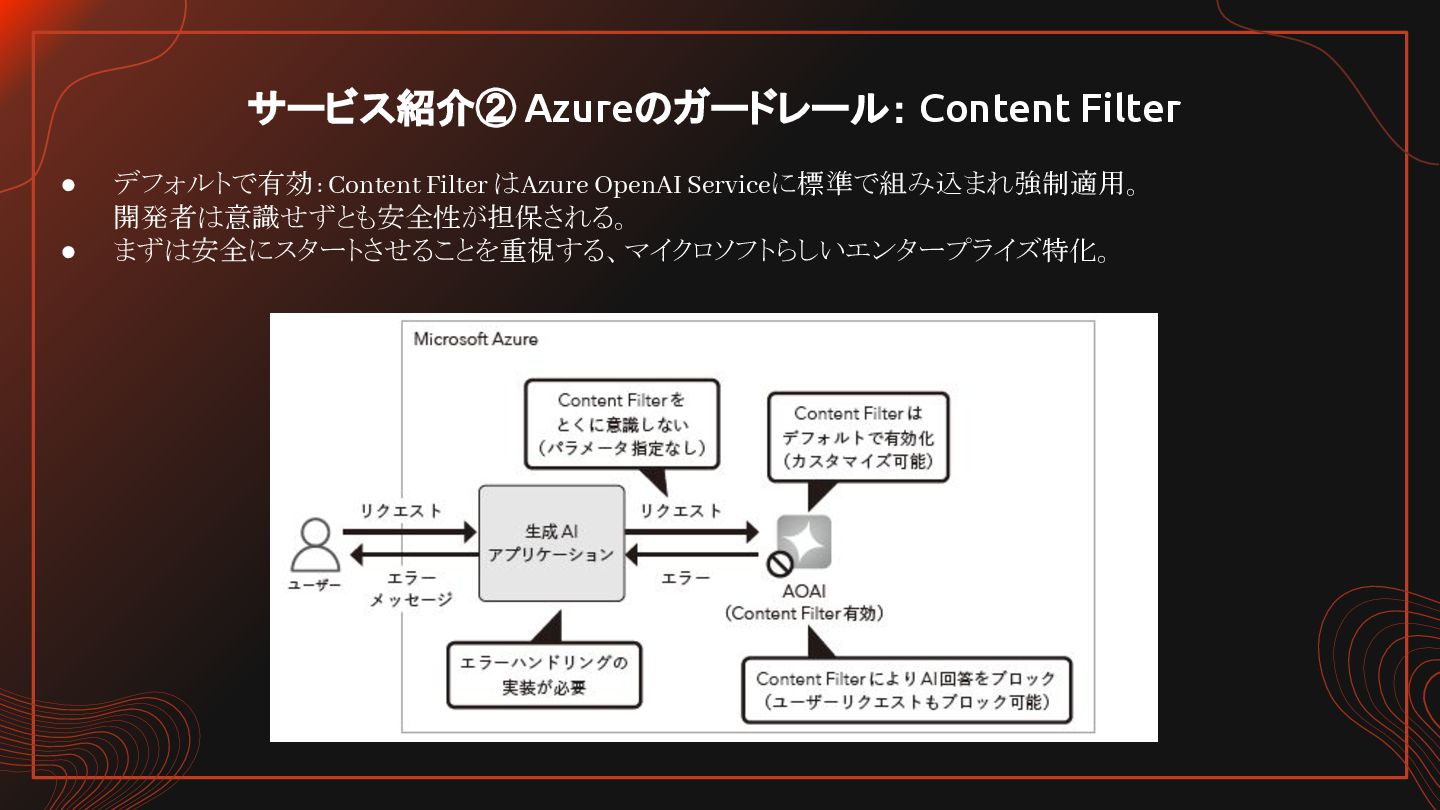 サービス紹介② Azureのガードレール: Content Filter • デフォルトで有効: Content Filter はAzure OpenAI