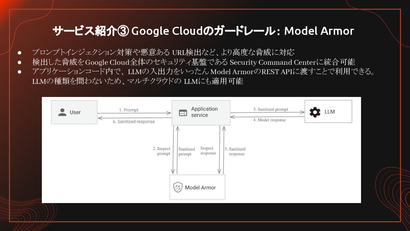 Cloud全体のセキュリティ基盤である Security Command Centerに統合可能 • アプリケーションコード内で、 LLMの入出力をいったん Model ArmorのREST APIに渡すことで利用できる。 LLMの種類を問わないため、マルチクラウドの LLMにも適用可能