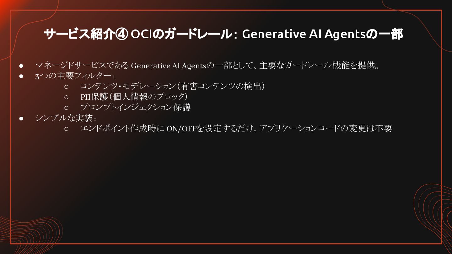 サービス紹介④ OCIのガードレール: Generative AI Agentsの一部 • マネージドサービスである Generative AI Agentsの一部として、主要なガードレール機能を提供。
