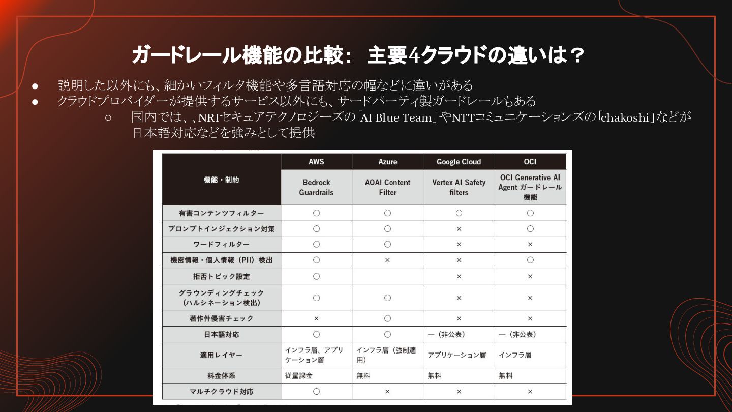 ガードレール機能の比較: 主要4クラウドの違いは? • 説明した以外にも、細かいフィルタ機能や多言語対応の幅などに違いがある • クラウドプロバイダーが提供するサービス以外にも、サードパーティ製ガードレールもある ◦ 国内では、、NRIセキュアテクノロジーズの「 AI Blue