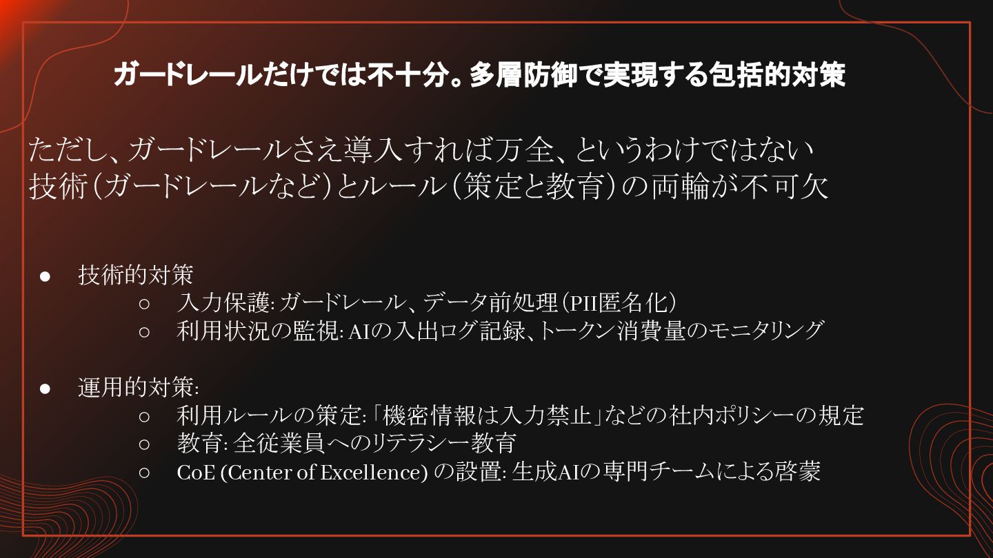 ガードレールだけでは不十分。多層防御で実現する包括的対策 ただし、ガードレールさえ導入すれば万全、というわけではない 技術(ガードレールなど)とルール(策定と教育)の両輪が不可欠 • 技術的対策 ◦ 入力保護: ガードレール、データ前処理(PII匿名化) ◦ 利用状況の監視: