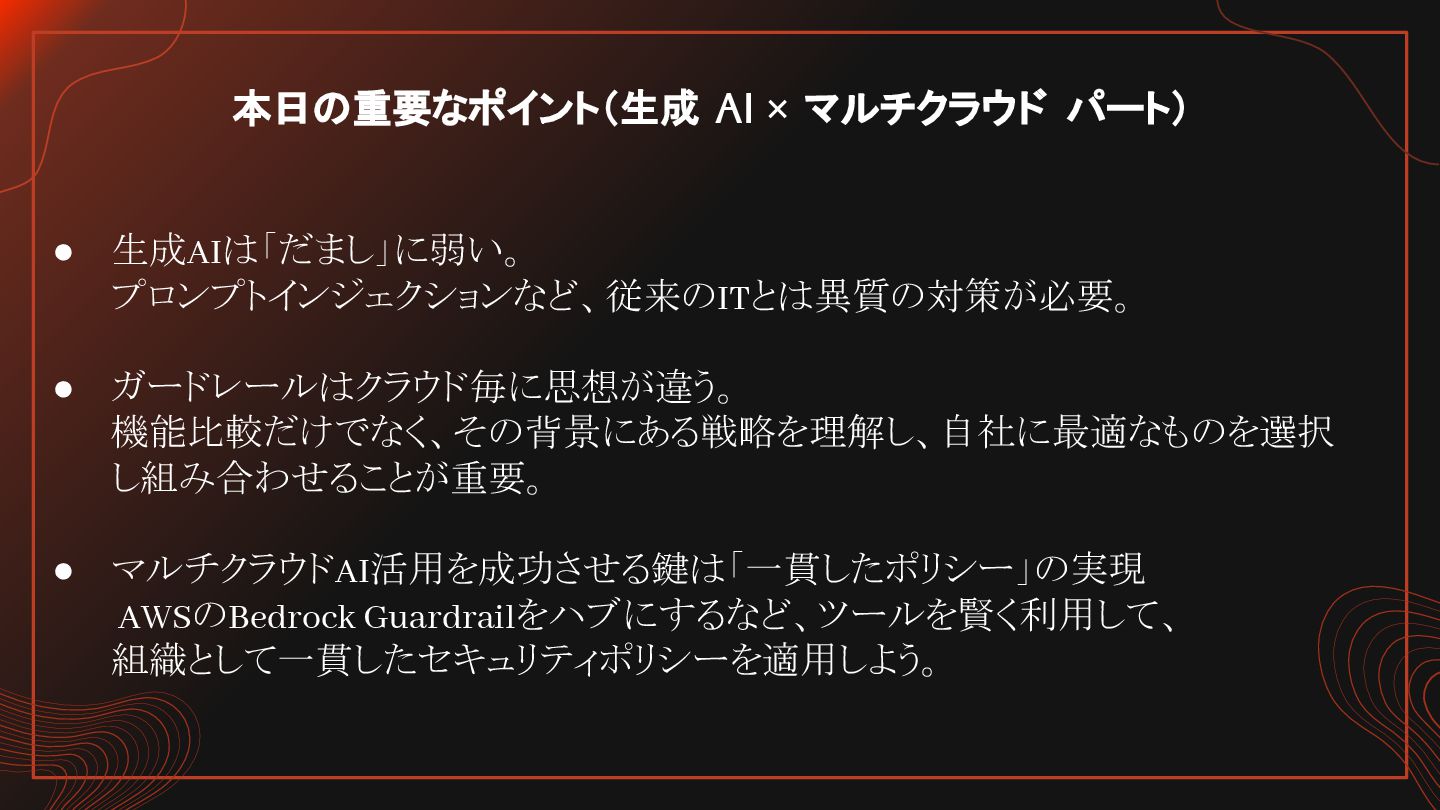 本日の重要なポイント(生成 AI × マルチクラウド パート) • 生成AIは「だまし」に弱い。 プロンプトインジェクションなど、従来のITとは異質の対策が必要。 • ガードレールはクラウド毎に思想が違う。