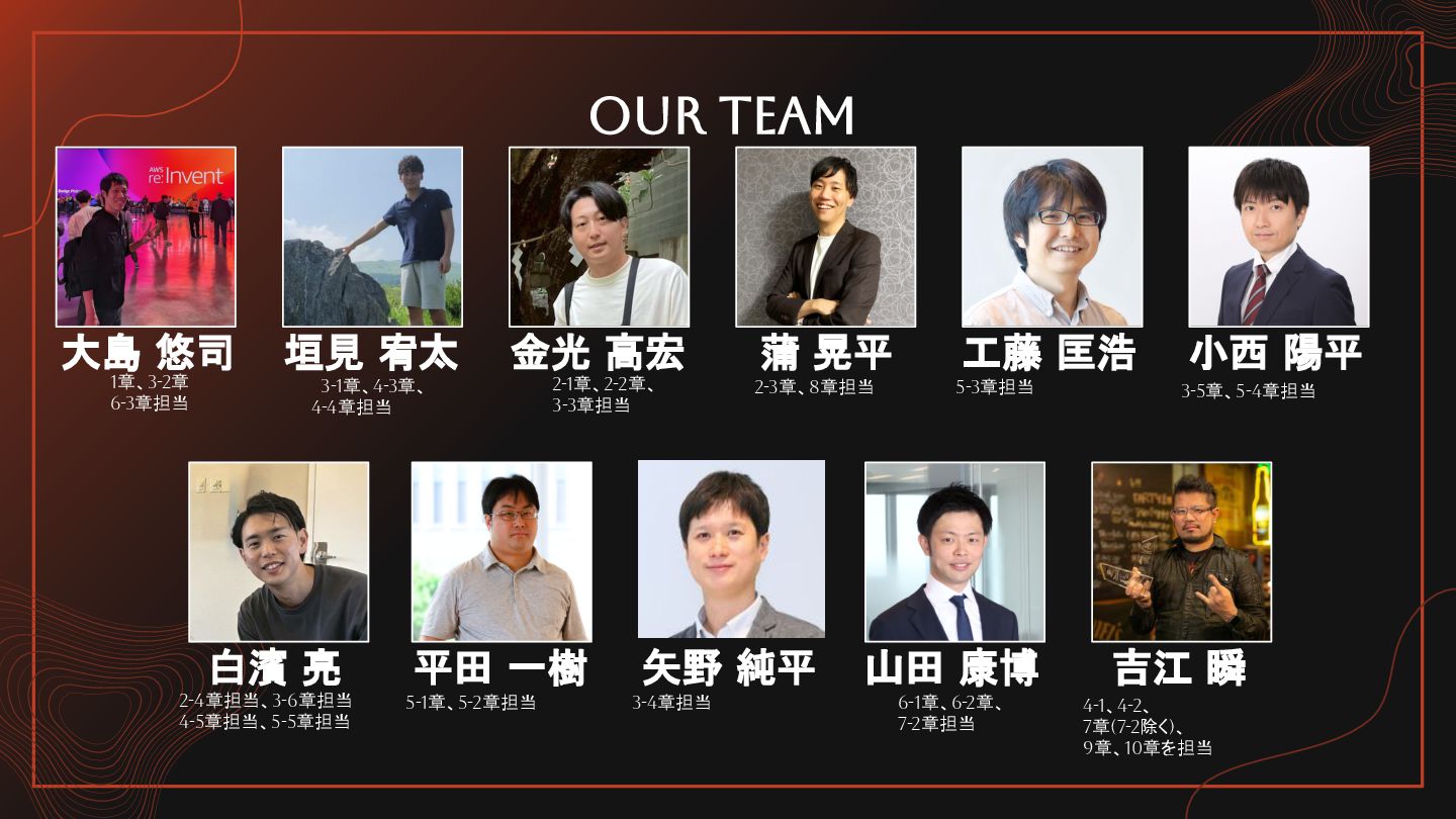 工藤 匡浩 小西 陽平 1章、3-2章 6-3章担当 3-1章、4-3章、 4-4章担当 2-1章、2-2章、 3-3章担当 2-3章、8章担当 5-3章担当 3-5章、5-4章担当 白濱 亮 平田 一樹 矢野 純平 山田 康博 吉江 瞬 2-4章担当、3-6章担当 4-5章担当、5-5章担当 5-1章、5-2章担当 3-4章担当 6-1章、6-2章、 7-2章担当 4-1、4-2、 7章(7-2除く)、 9章、10章を担当