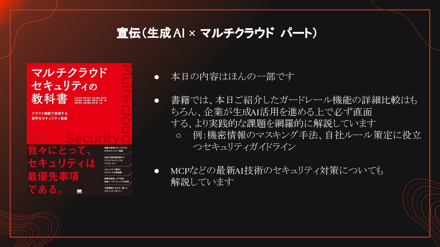 宣伝(生成 AI × マルチクラウド パート) • 本日の内容はほんの一部です • 書籍では、本日ご紹介したガードレール機能の詳細比較はも ちろん、企業が生成AI活用を進める上で必ず直面