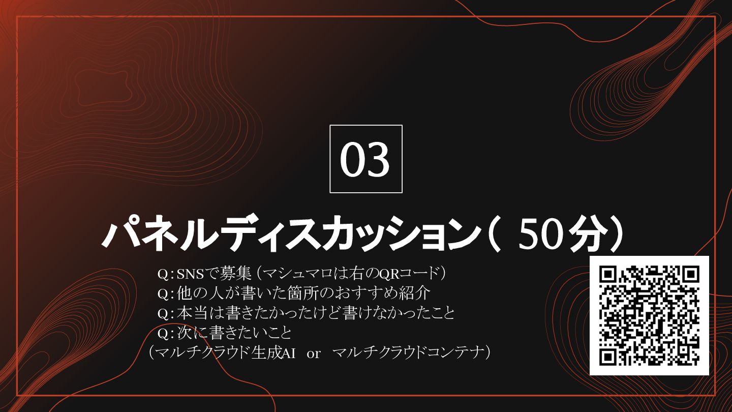 パネルディスカッション( 50分) 03 Q:SNSで募集 (マシュマロは右のQRコード) Q:他の人が書いた箇所のおすすめ紹介 Q:本当は書きたかったけど書けなかったこと Q:次に書きたいこと (マルチクラウド生成AI or マルチクラウドコンテナ)