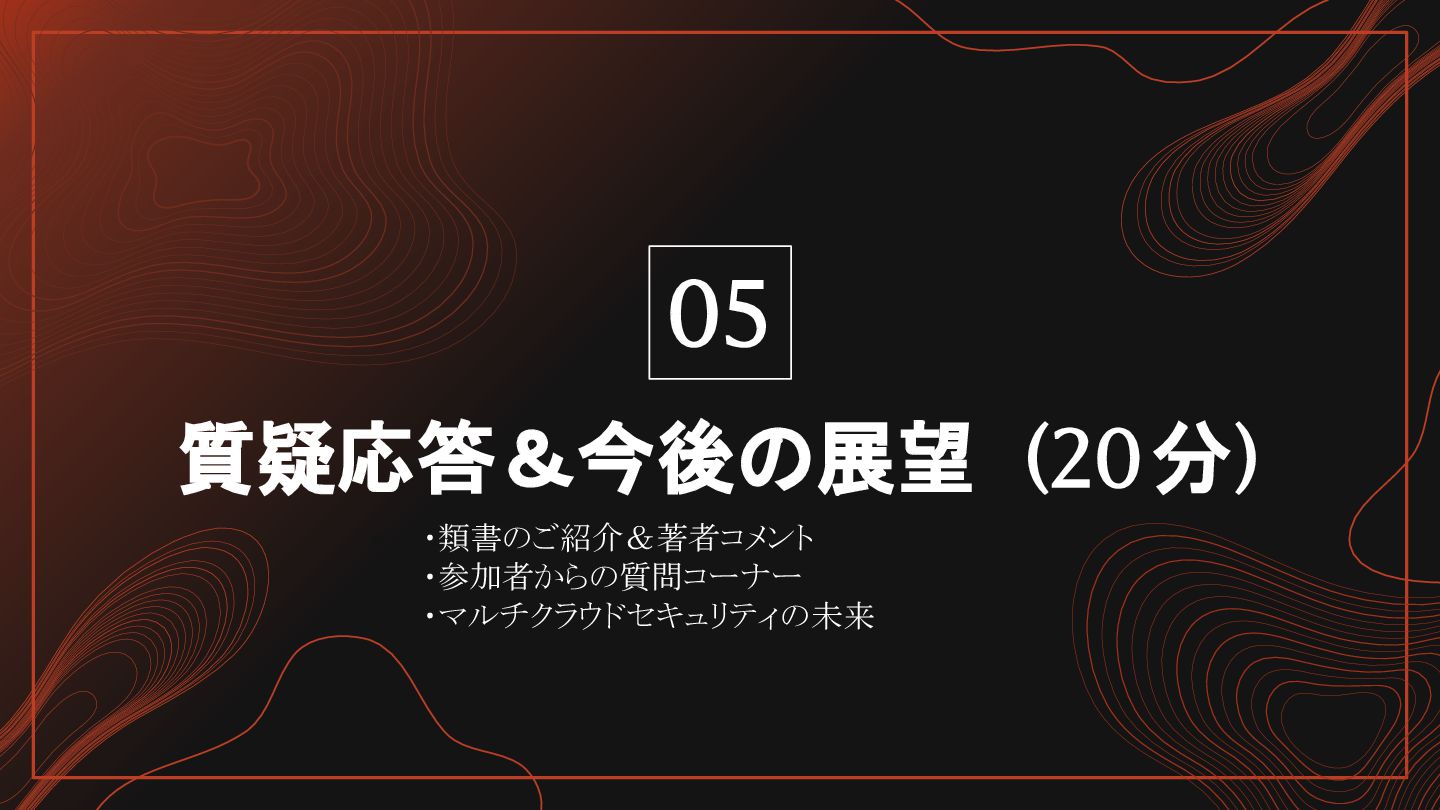 質疑応答&今後の展望 (20分) 05 • ・類書のご紹介&著者コメント • ・参加者からの質問コーナー • ・マルチクラウドセキュリティ の未来