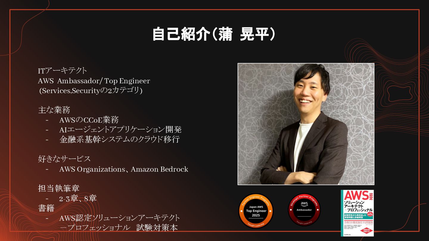 自己紹介(蒲 晃平) ITアーキテクト AWS Ambassador/ Top Engineer (Services,Securityの2カテゴリ) 主な業務 -