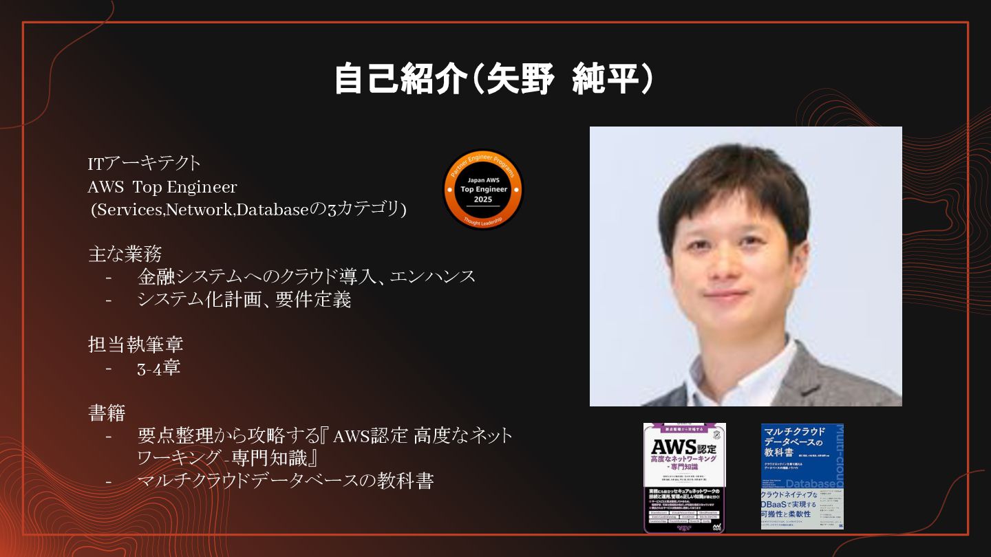 自己紹介(矢野 純平) ITアーキテクト AWS Top Engineer (Services,Network,Databaseの3カテゴリ) 主な業務 - 金融システムへのクラウド導入、エンハンス