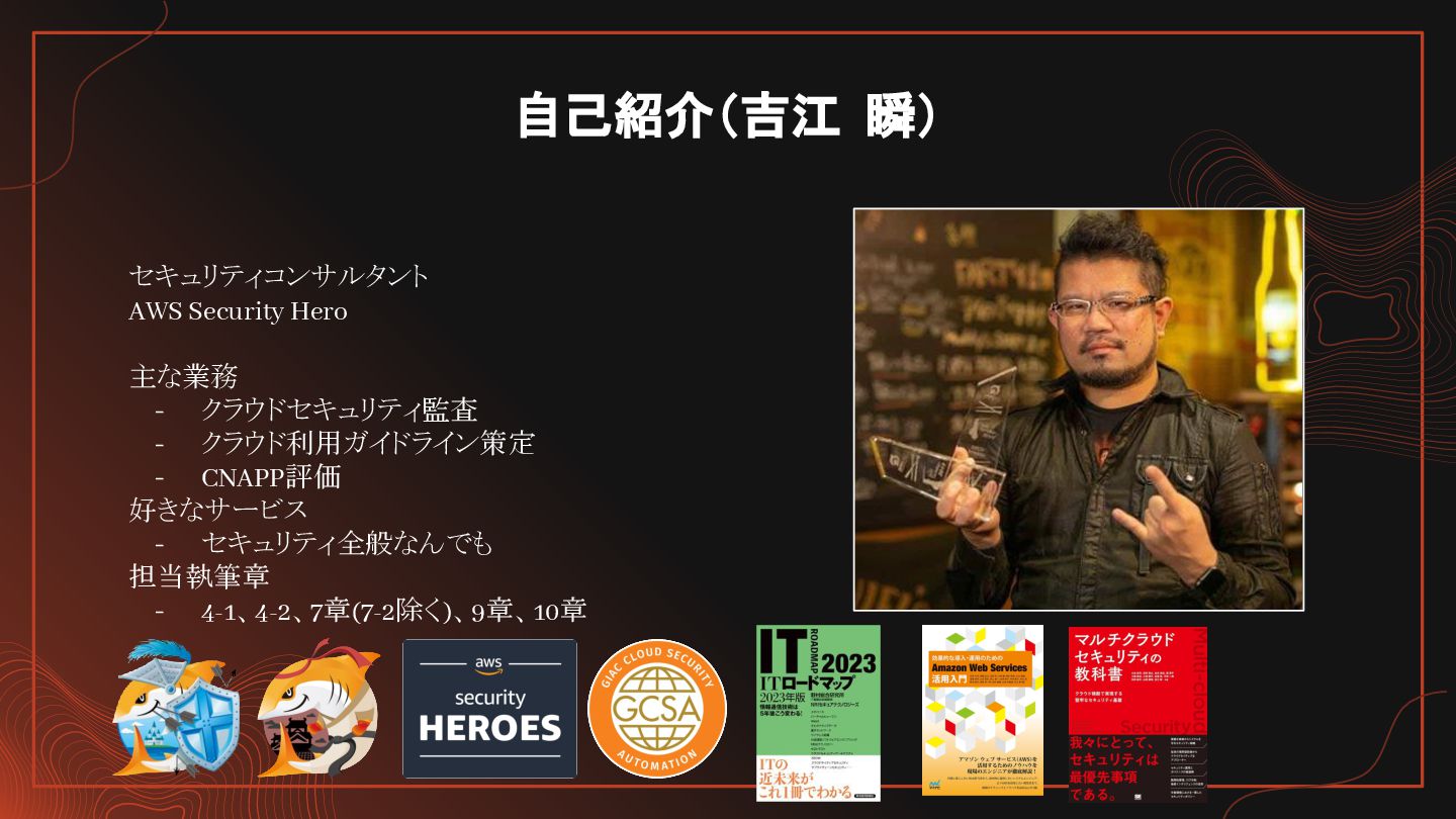 自己紹介(吉江 瞬) セキュリティコンサルタント AWS Security Hero 主な業務 - クラウドセキュリティ監査 -