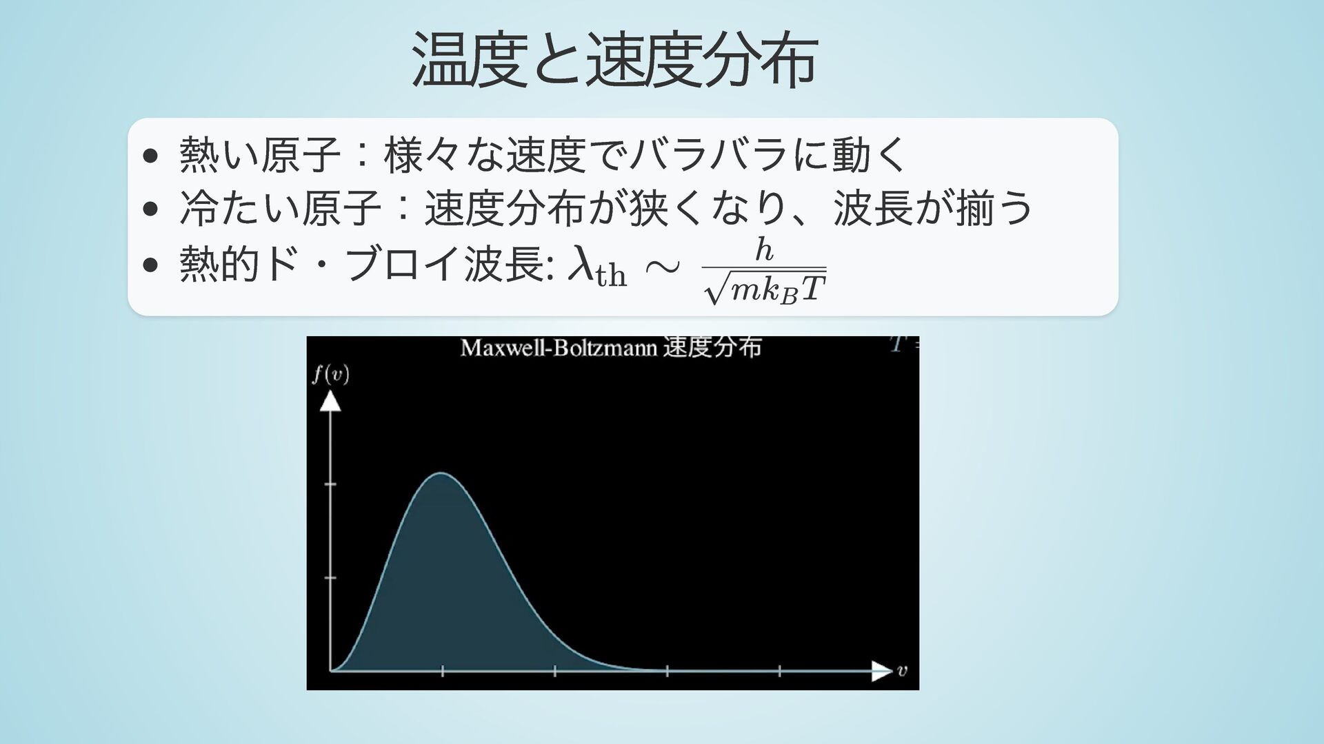 干渉縞がぼや ける 冷却して速度分布を狭くする → 波長が揃う → コ ヒーレンス向上 λ ​ = dB ​ mv h h m v